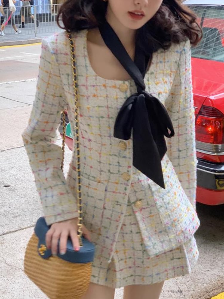 ツイードツーピースセット秋冬conjuntos femininosエレガンテスジャケットコート+スカート2点セット衣装 エレガント ウィンター 冬物