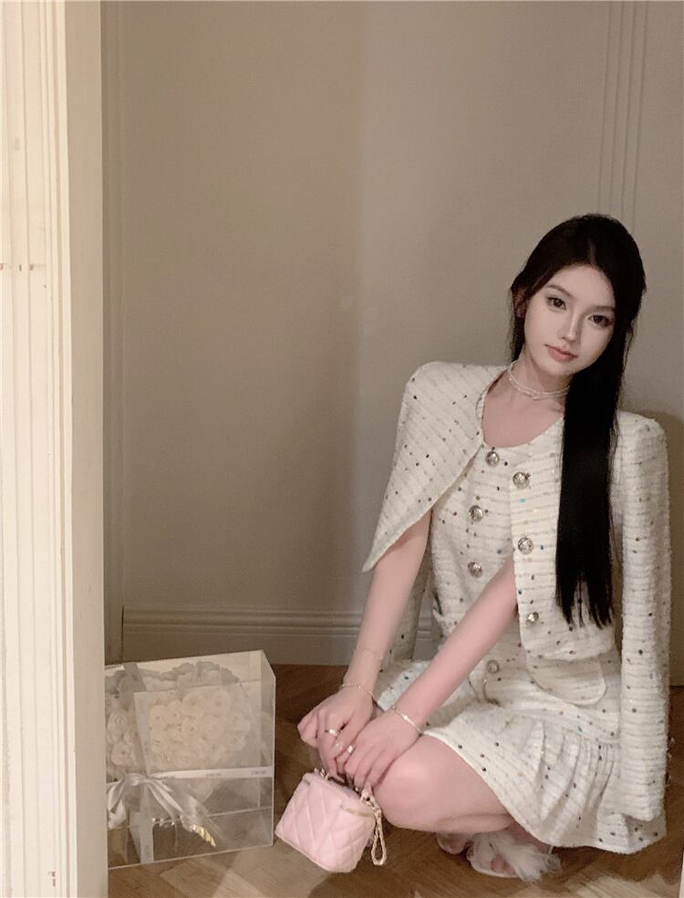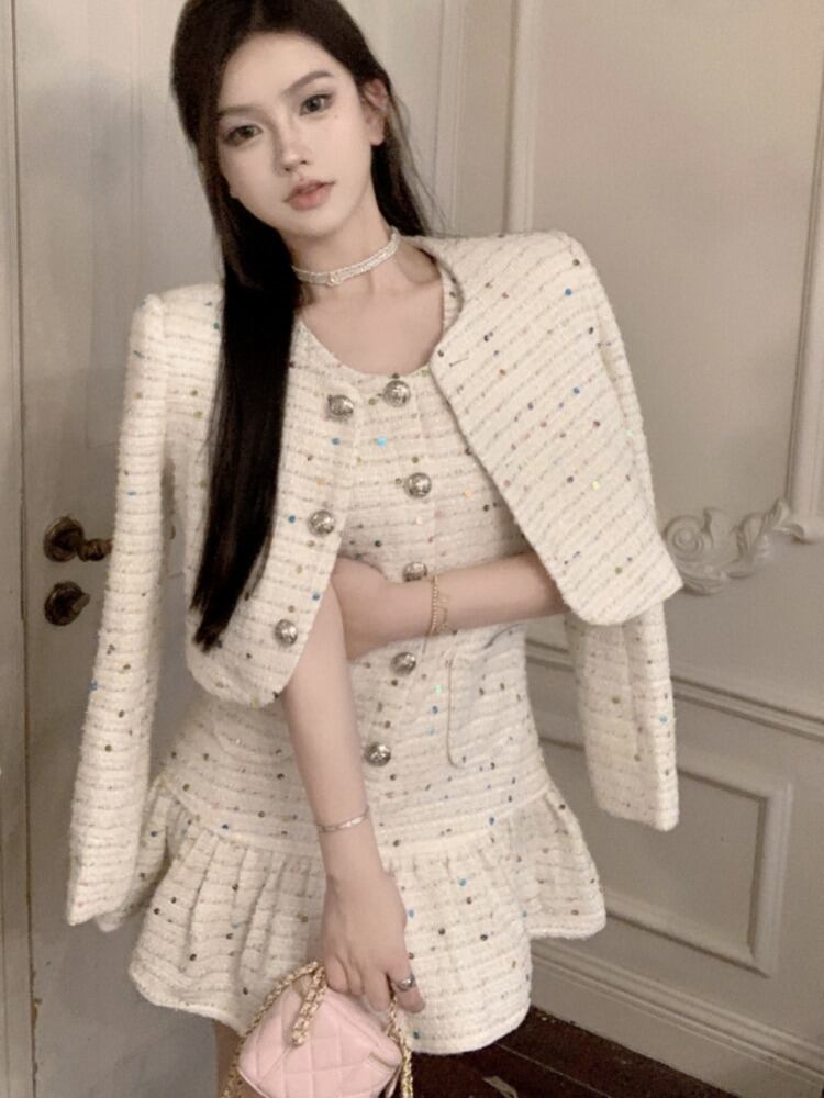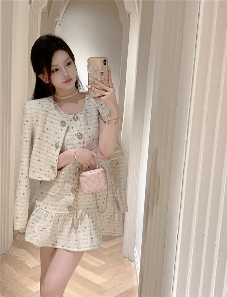 秋冬フレンチスモールフレグランスツイード2点セットショートジャケットコート+ドレススーツストリート2点セット ウィンター 冬物