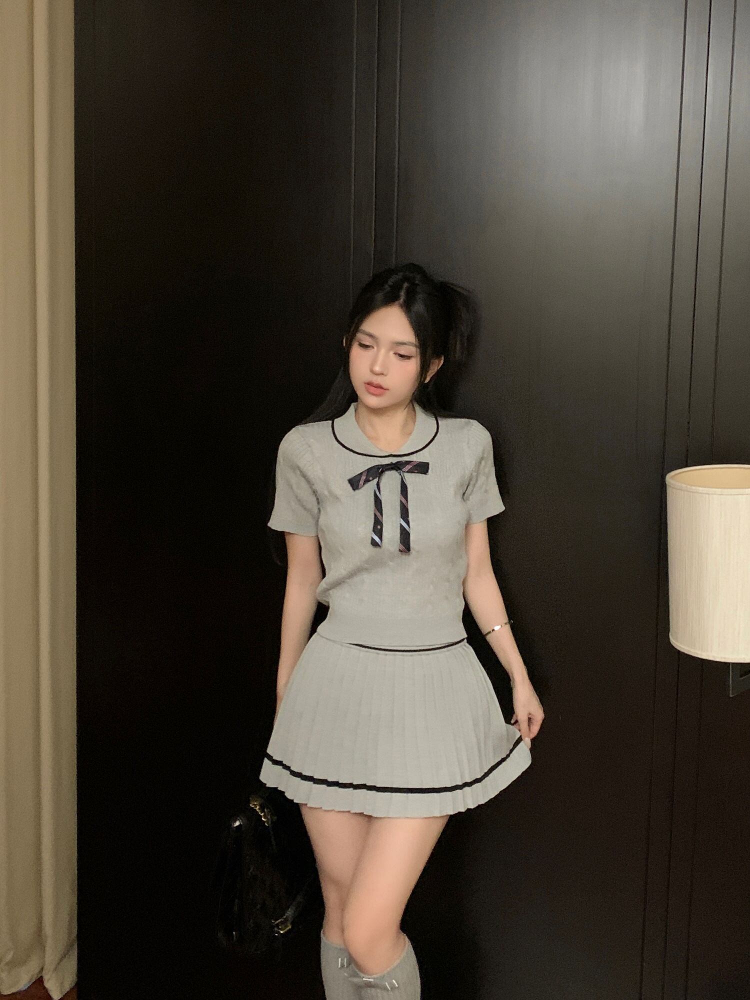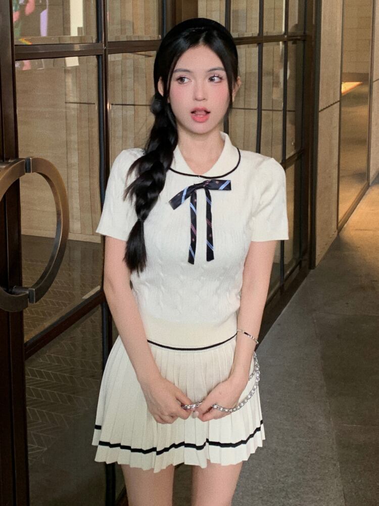 甘いニット 2 点セットボウプルオーバーセータートップ + プリーツスカートセットプレッピースタイル 2 ピース衣装 リボン 大人ガーリー スウィート キュート カジュアル