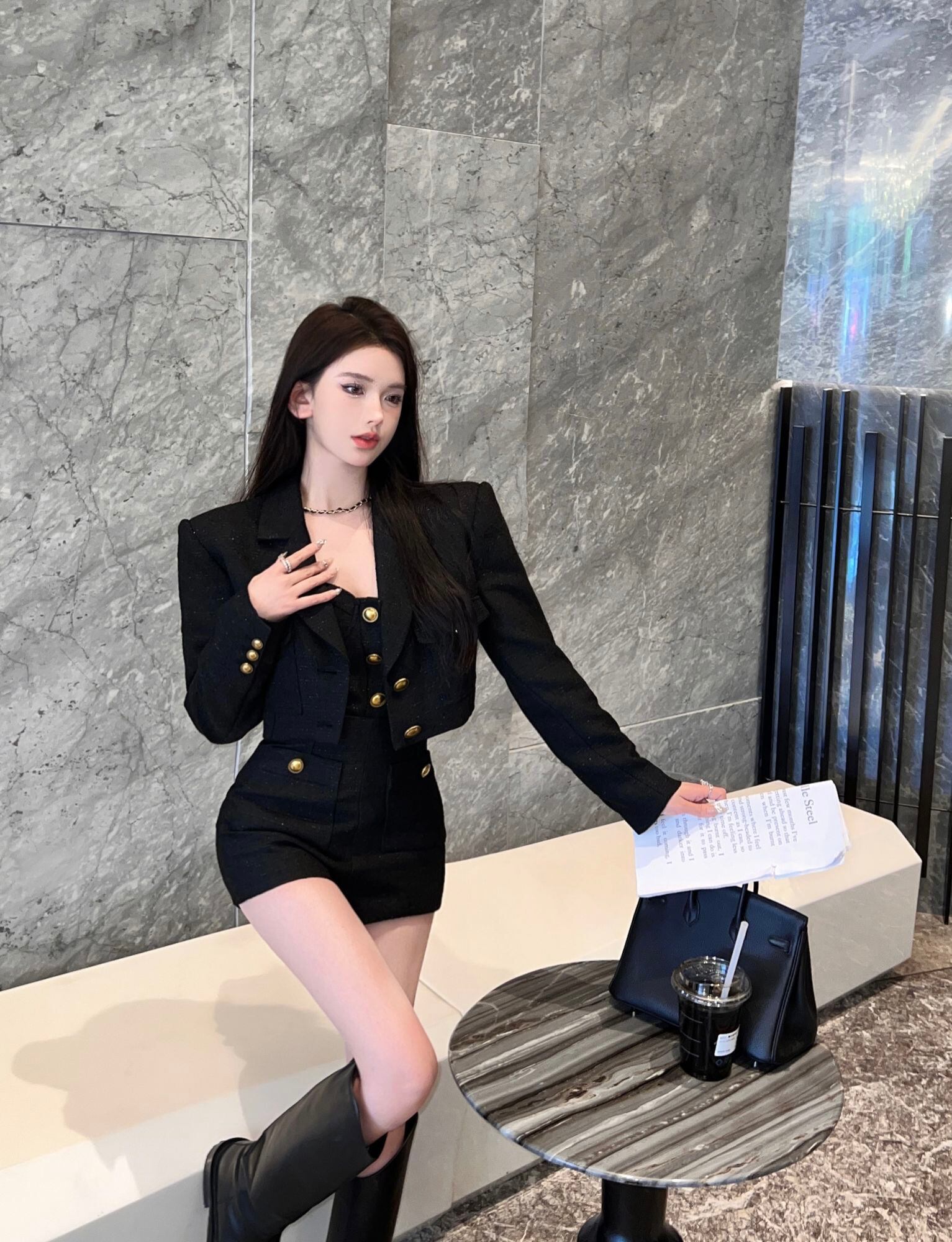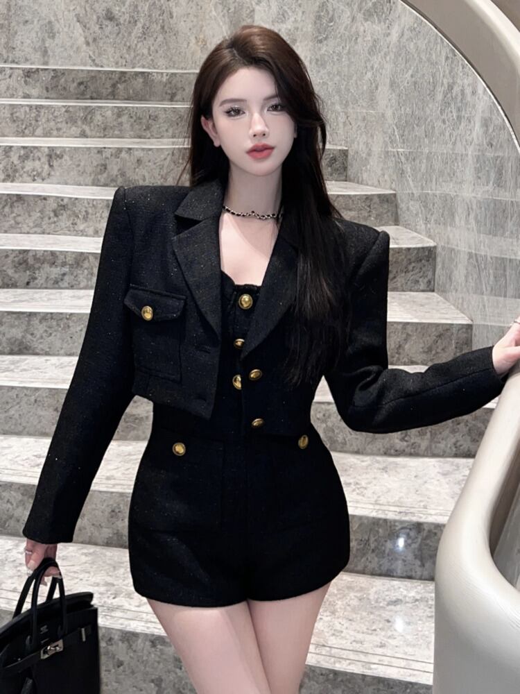ストリート小さ香りツイード 2 点セットショートジャケットコート + セクシージャンプスーツフレンチ秋冬 2 ピース衣装 ウィンター 冬物