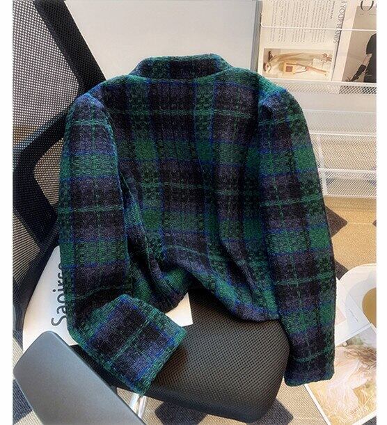 グリーンチェック柄ツイードジャケット秋冬フレンチレトロウエスタンウールショートコートアウター ウィンター 冬物