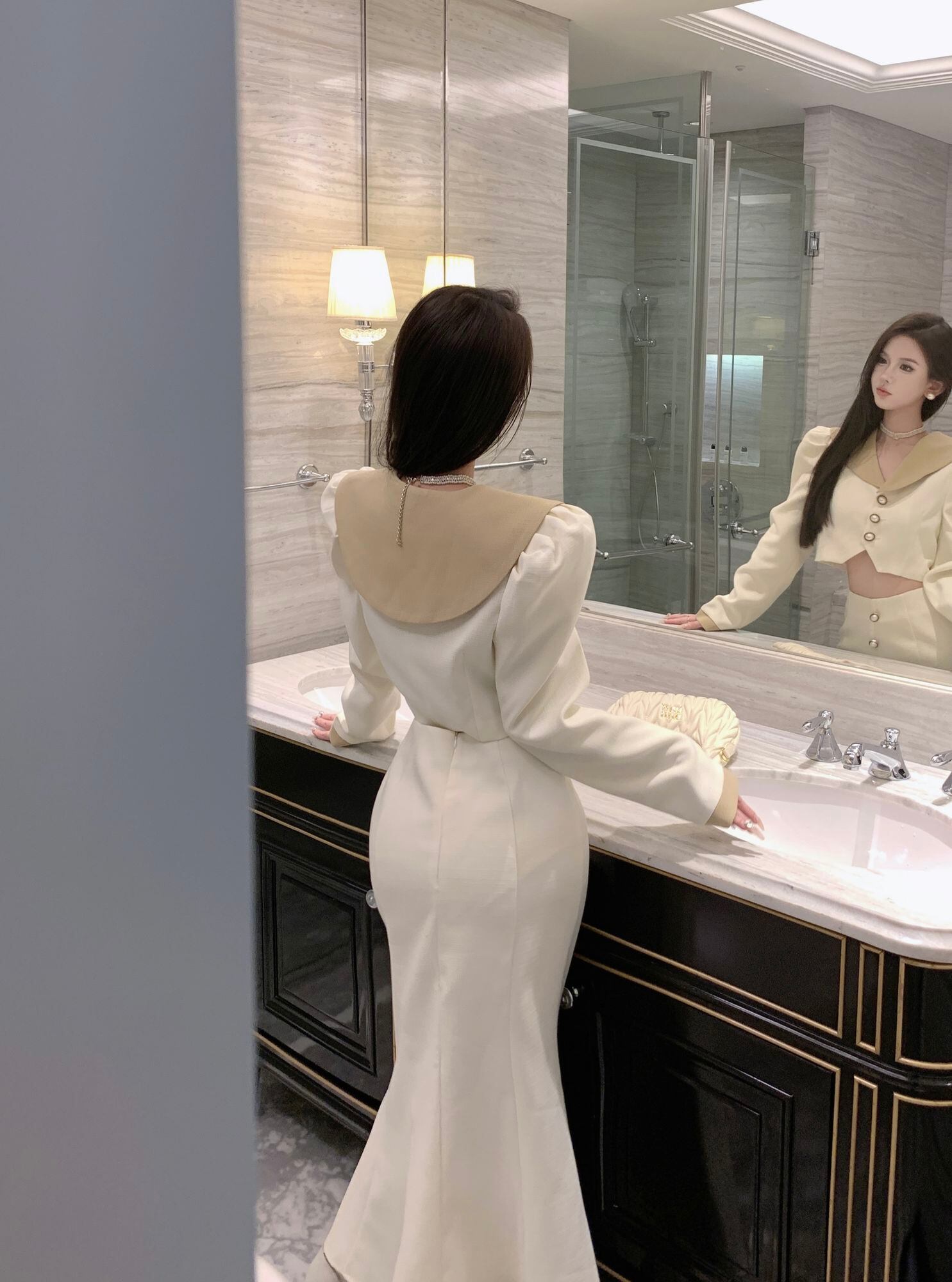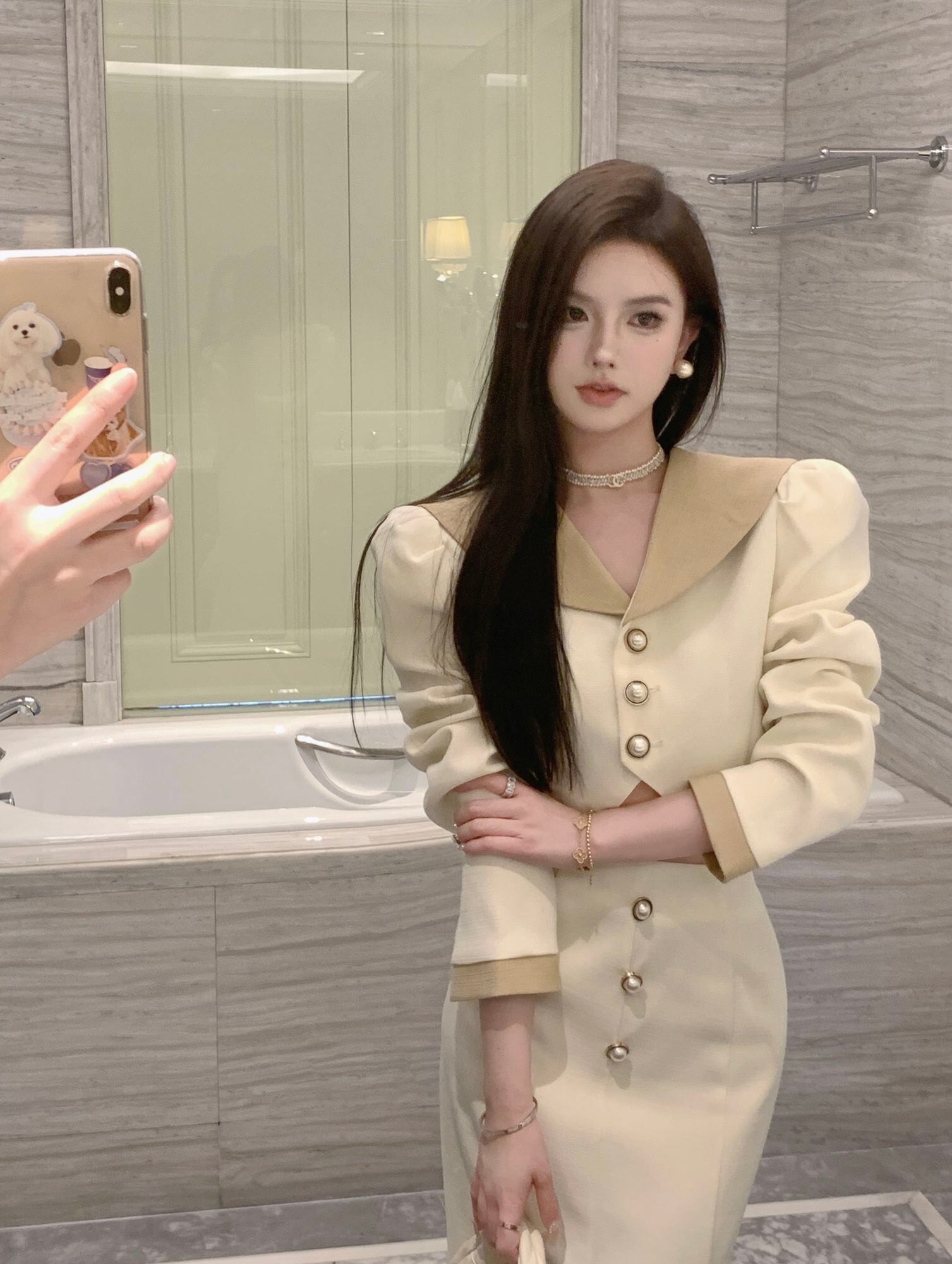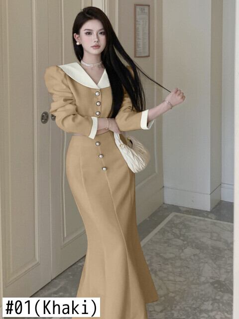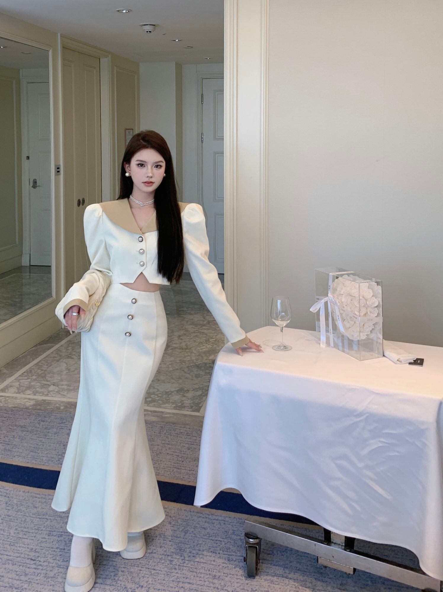 ストリートOLツーピースセットレディースバブルスリーブショートコート+ウエストフィッシュテールスカート2点衣装