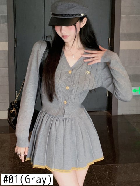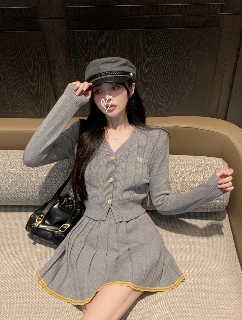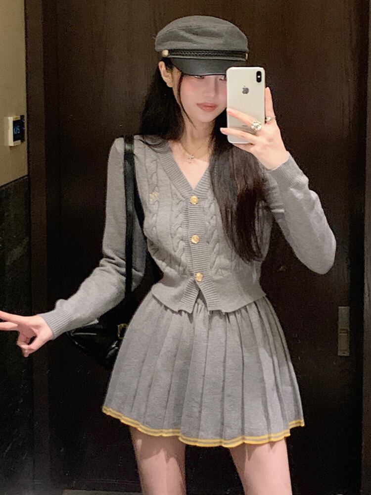 プレッピースタイルガールズニットツーピースセットカーディガンコート+プリーツスカートセット秋セーター2ピーススーツ