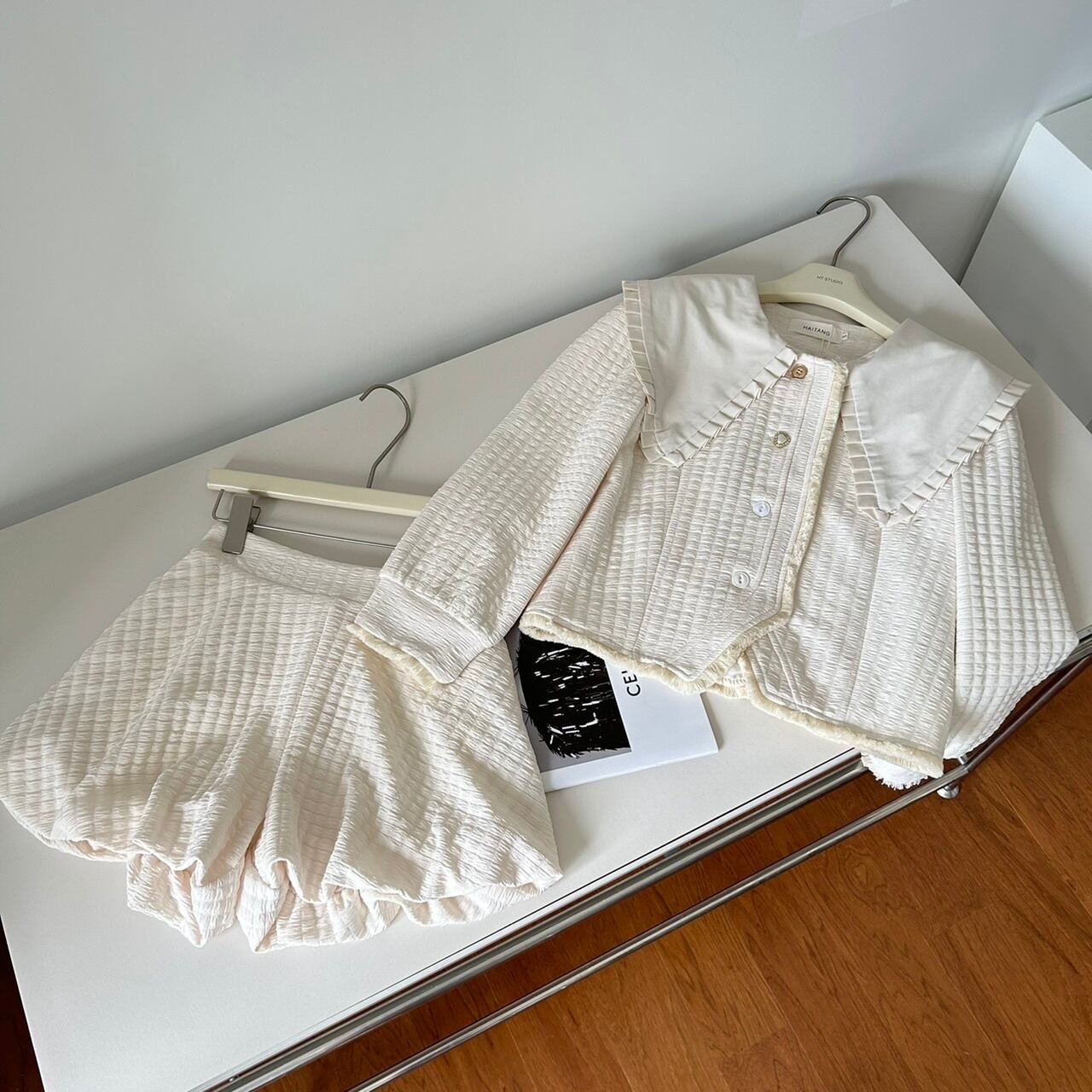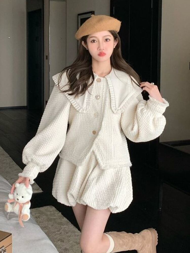 秋冬フレンチスモールフレグランスツーピースセットパフスリーブジャケットコート+ウエストショートセット甘いパンツセット 大人ガーリー スウィート キュート カジュアル オータム 秋物 ウィンター 冬物