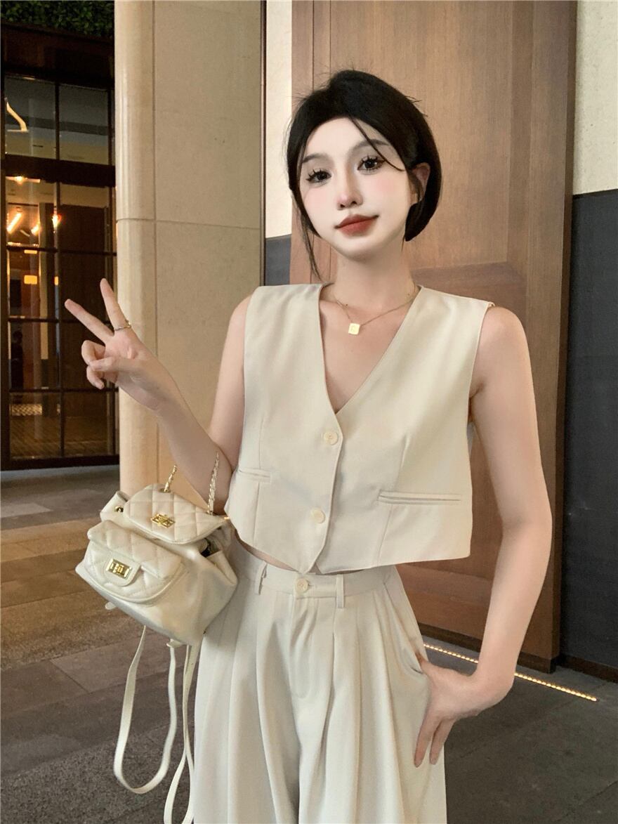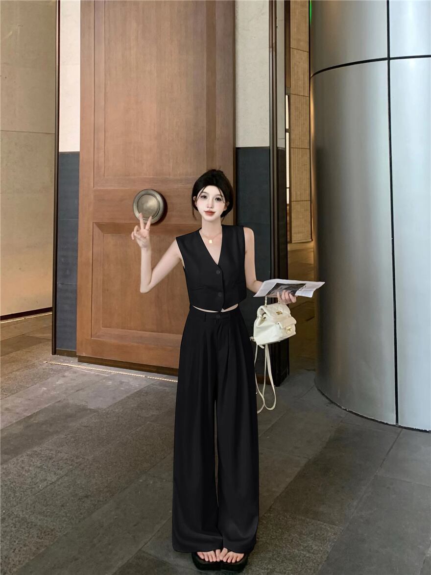 ツーピースセットオフィスレディベストクロップトップ&ワイドレッグパンツセットフライドストリート2ピーススーツ ワイドパンツ 会社 学校 通勤や通学にも