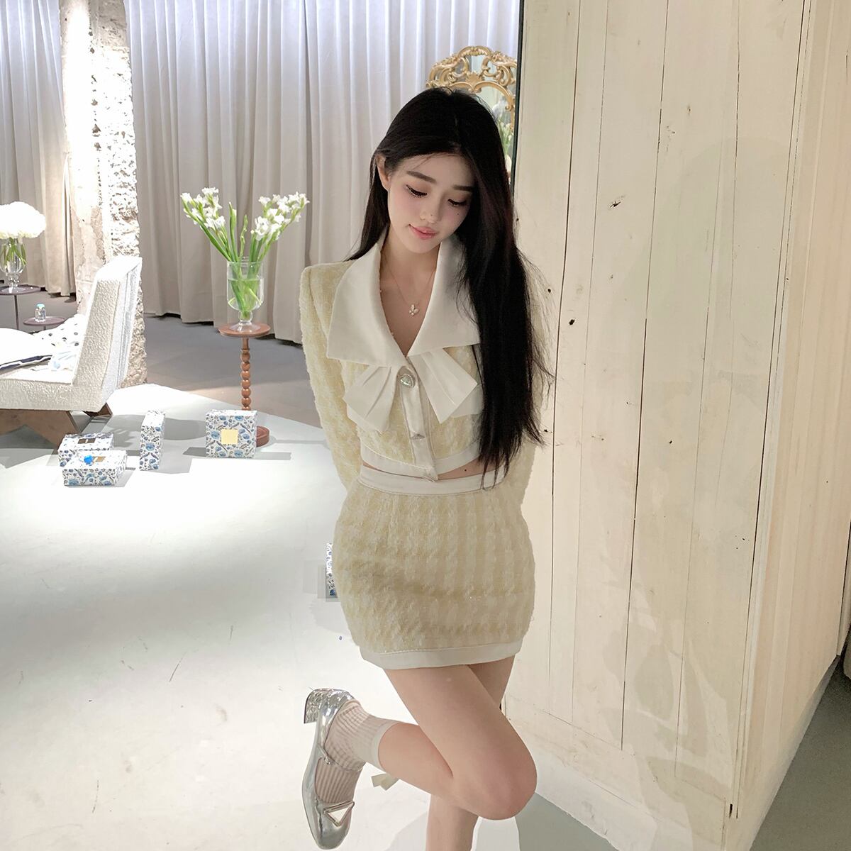高級小さフレグランツイード 2 点セットクロップトップウールショートジャケットコート + スカートセット甘い 2 ピーススーツ 大人ガーリー スウィート キュート カジュアル