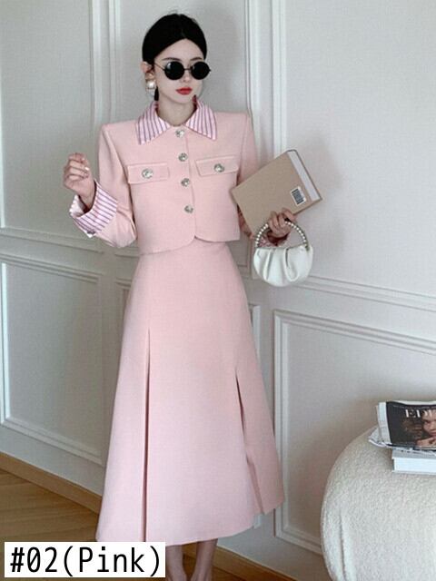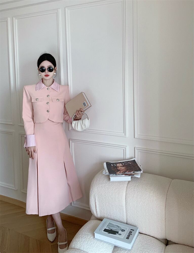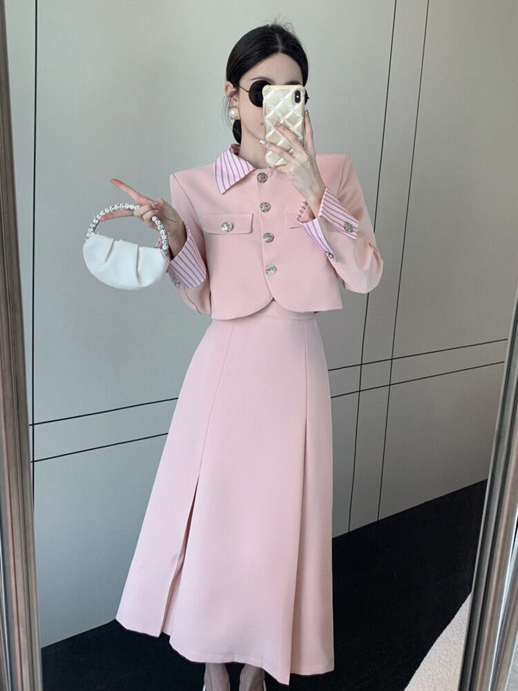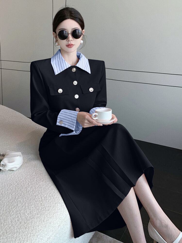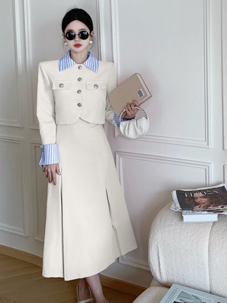 秋冬コントラストストライプパッチワークブレザーコート+ウエストプリーツスカートスーツOLツーピースセット オータム 秋物 ウィンター 冬物