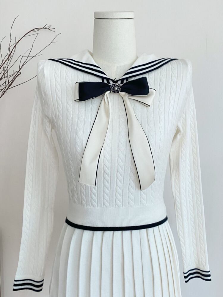 ガールズスイートニットツーピースセットトップ+プリーツスカートセット秋プレッピースタイルボウプルオーバーセーター&スカート2点衣装 リボン 大人ガーリー スウィート キュート カジュアル