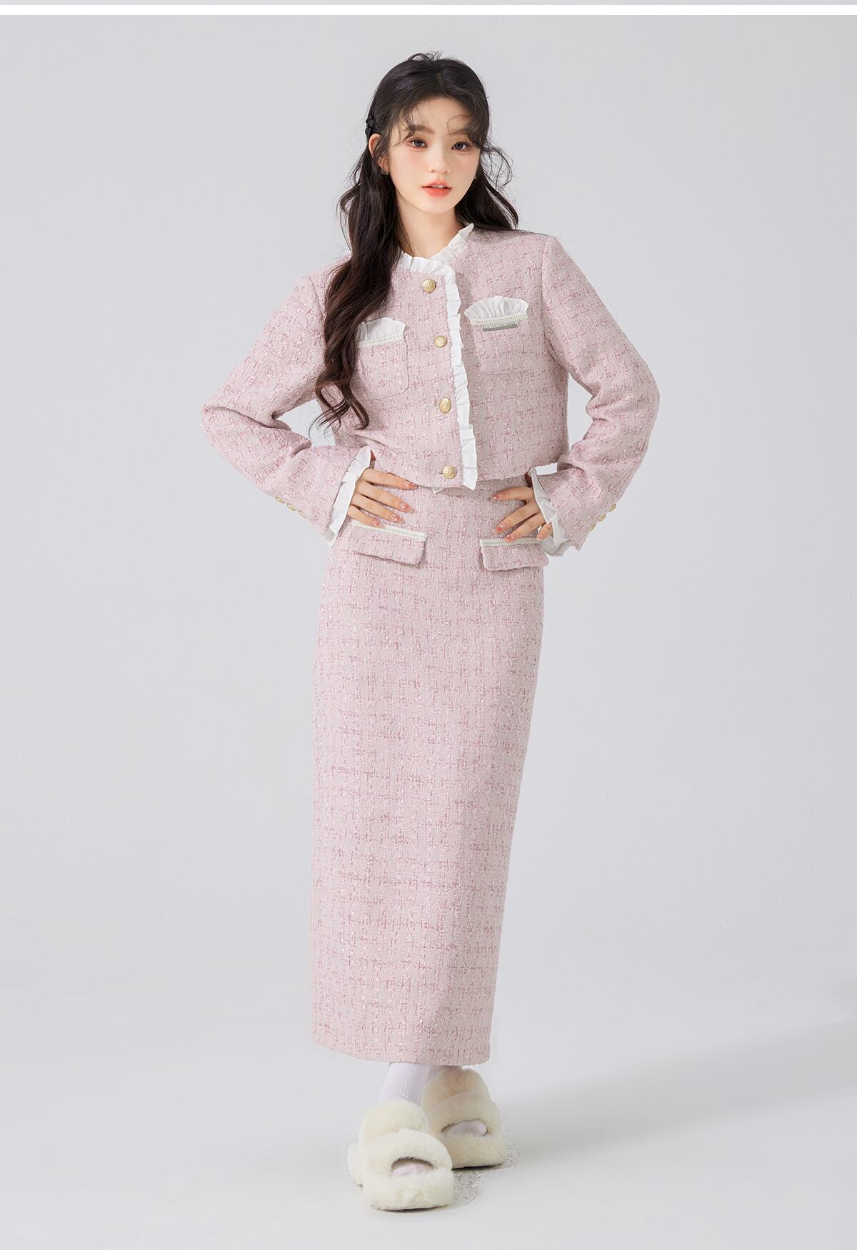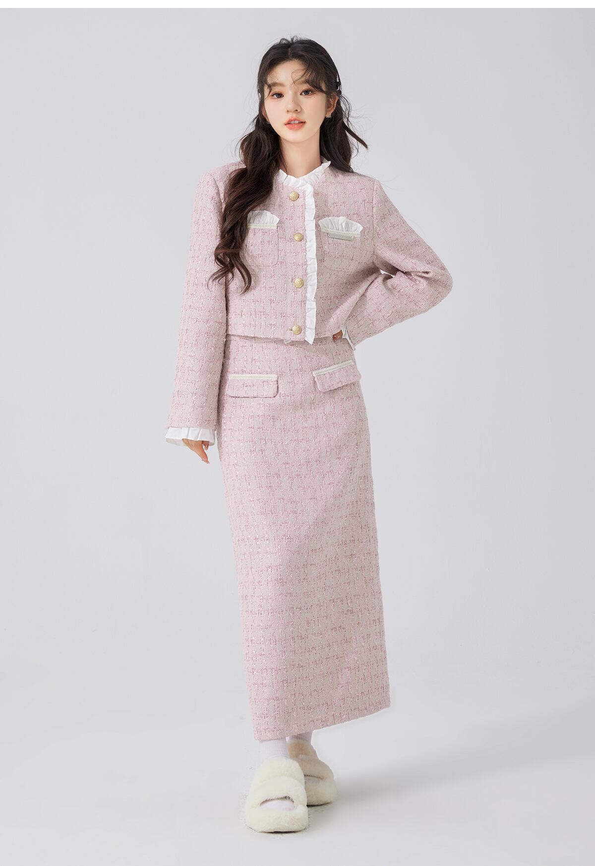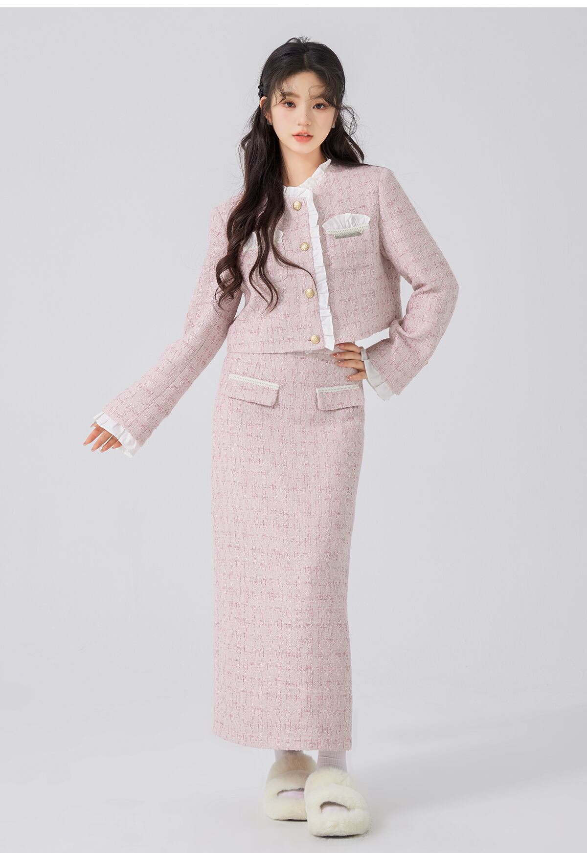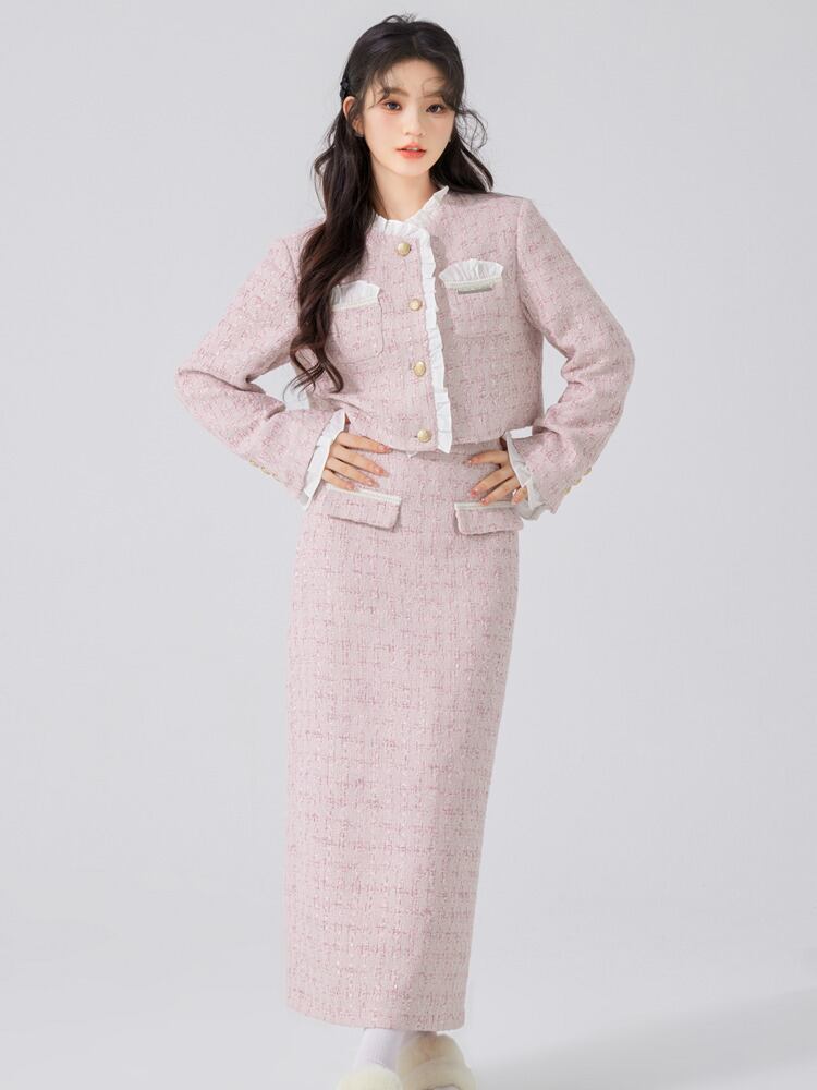 フランス小さフレグランスツイード 2 ピースセット衣装甘いショートジャケットコート + ロングスカートツーピーススーツ 大人ガーリー スウィート キュート カジュアル