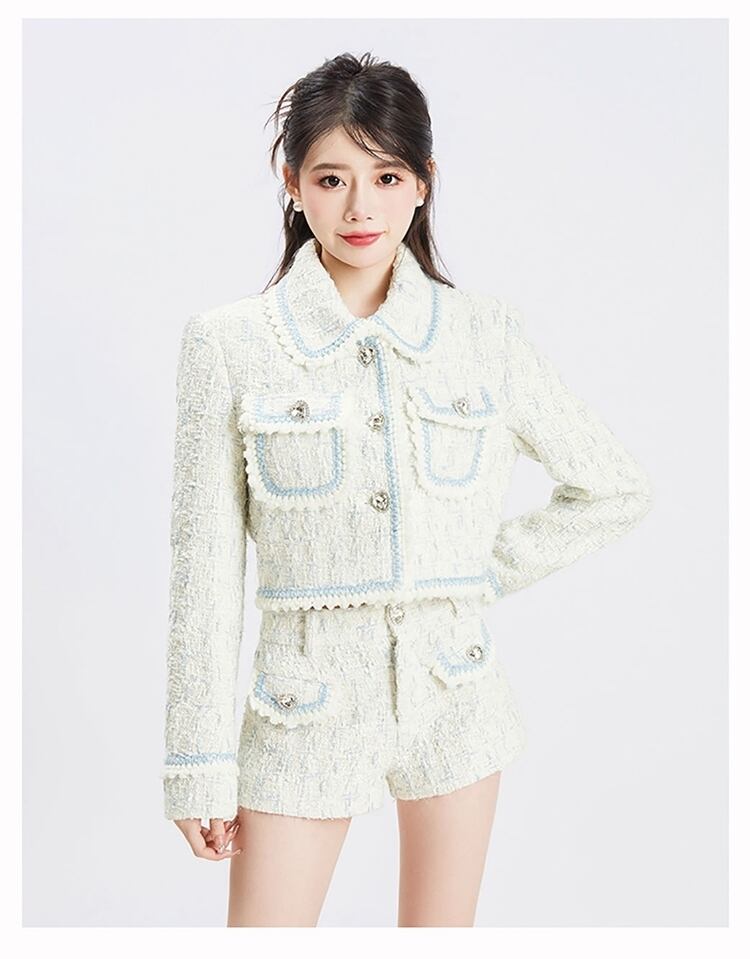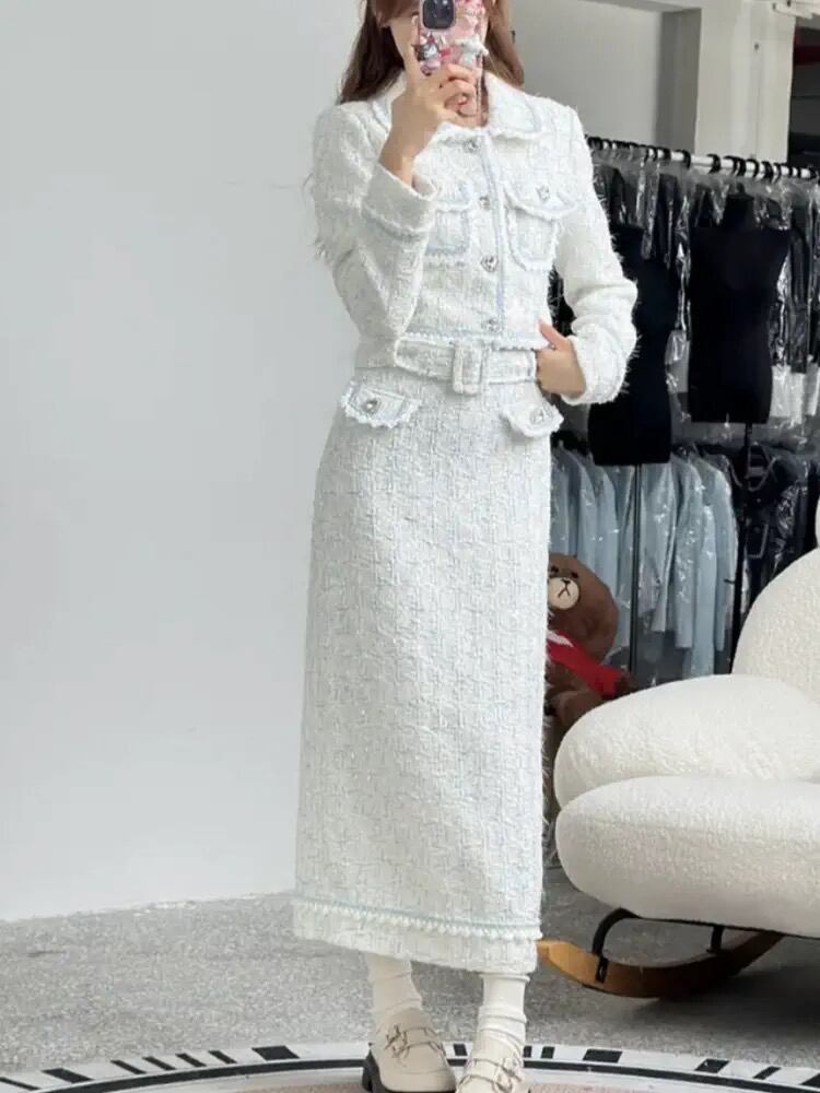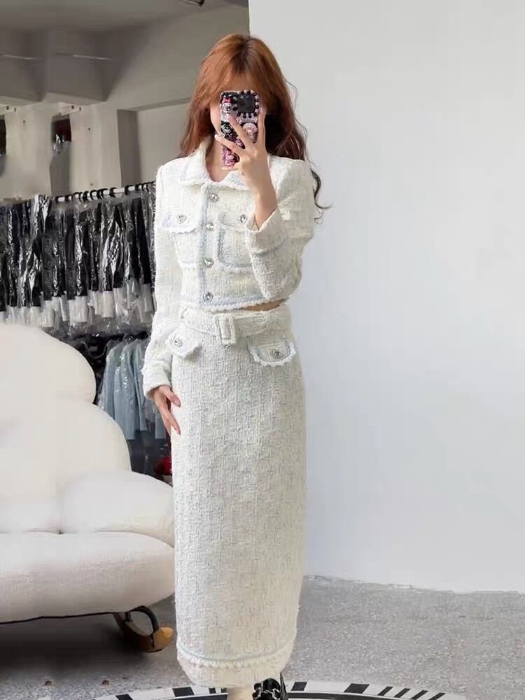 フランス小さフレグランスツイード 2 点セットショートジャケットコート + スカートスーツ高級 2 ピース衣装