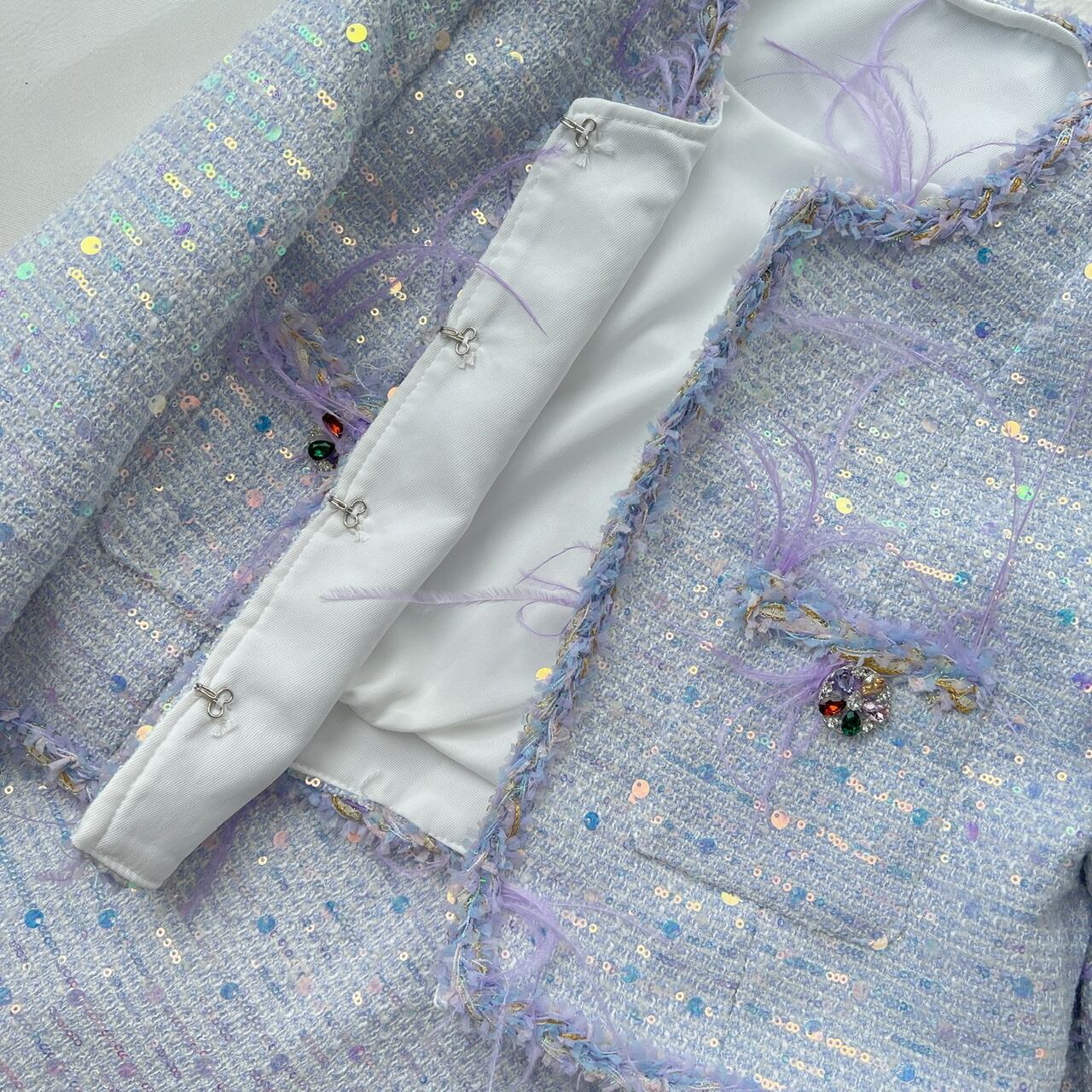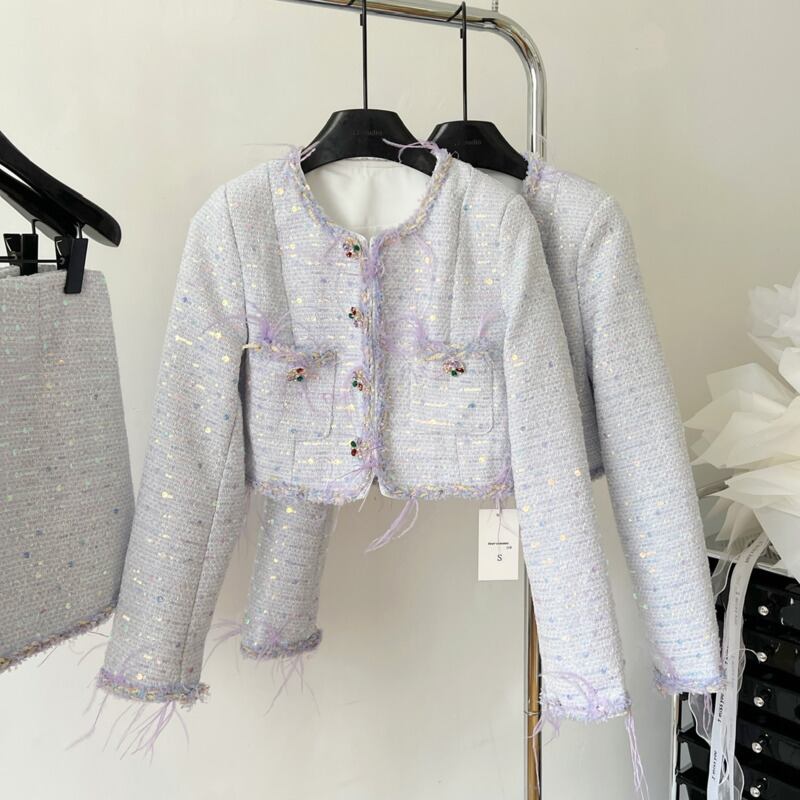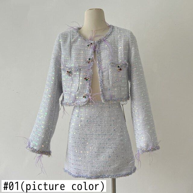 高級羽スパンコール小さフレグランツイード 2 点セットショートジャケットコート + ミニスカート 2 ピーススーツ