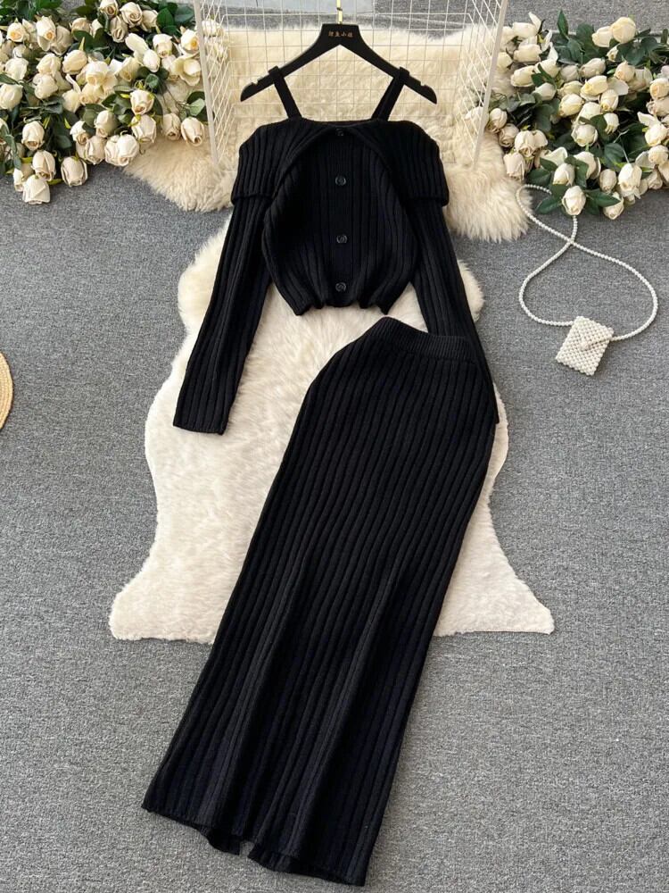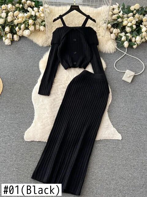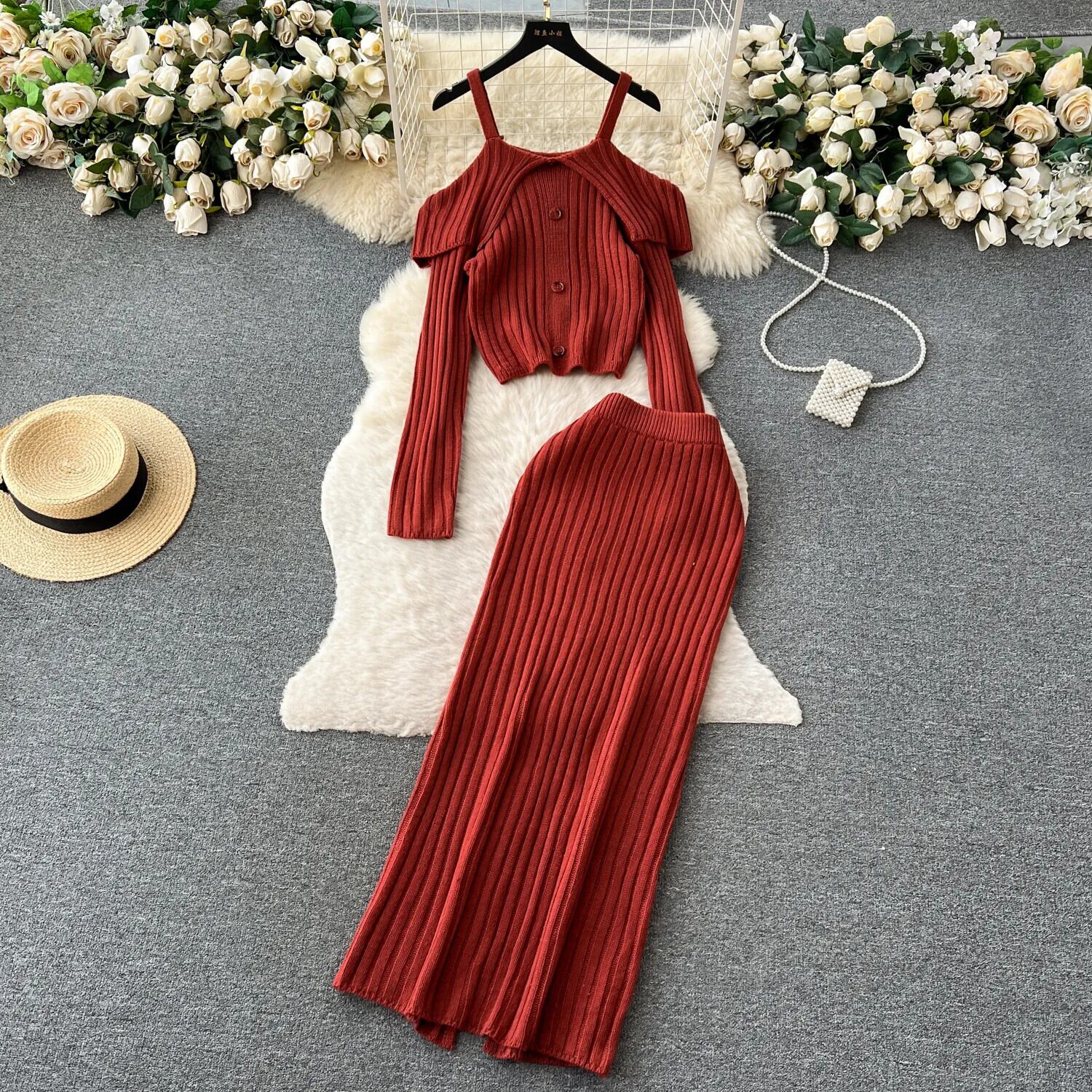 秋冬ニット 2 点セットプルオーバーセータートップ + ロングスカートセットフレンチ 2 ピース衣装 ウィンター 冬物