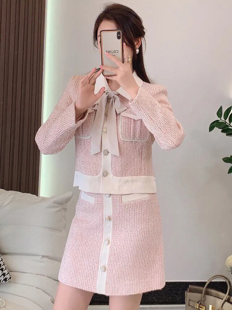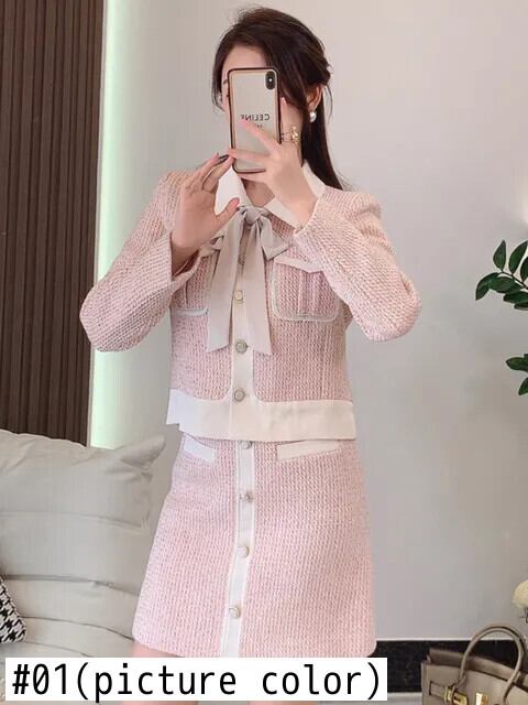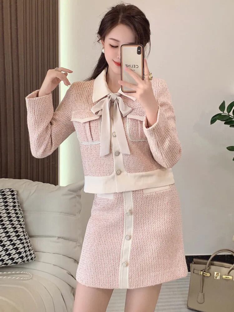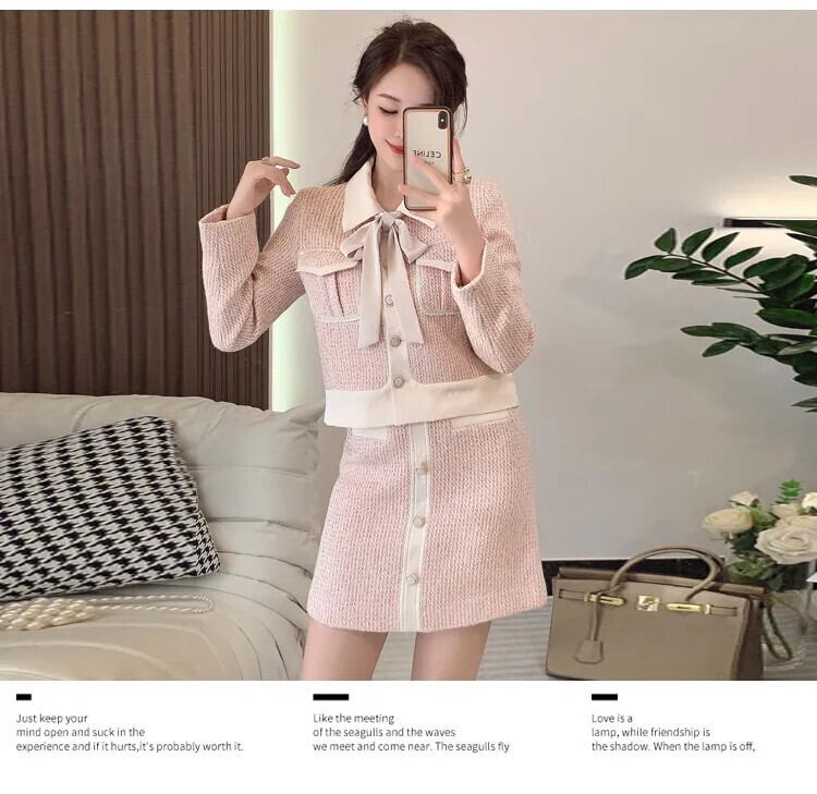 フランス小さ香りツーピースセット秋冬甘いショートジャケットコート + スカート 2 ピース衣装 大人ガーリー スウィート キュート カジュアル ウィンター 冬物