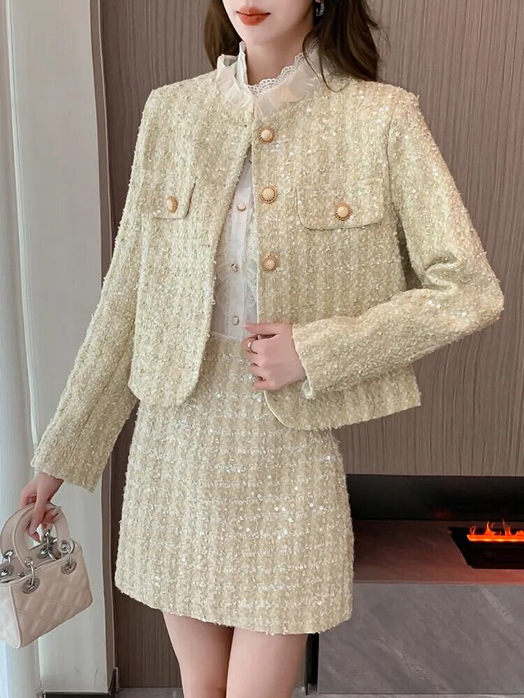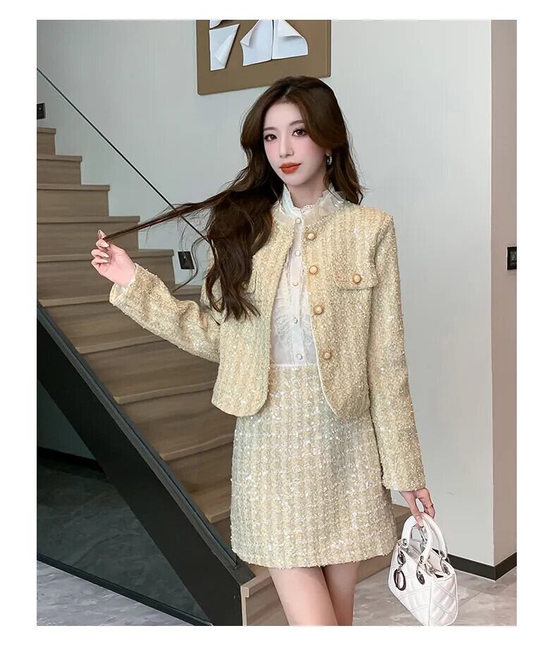 ストリートフレンチ高級スパンコールツイードツーピースセットジャケットコート+スカートスーツ小さフレグランス2点セット