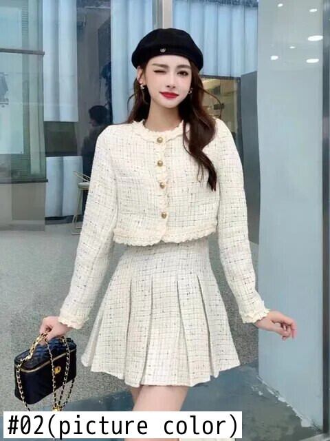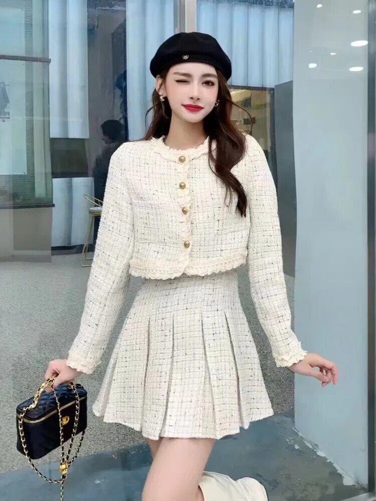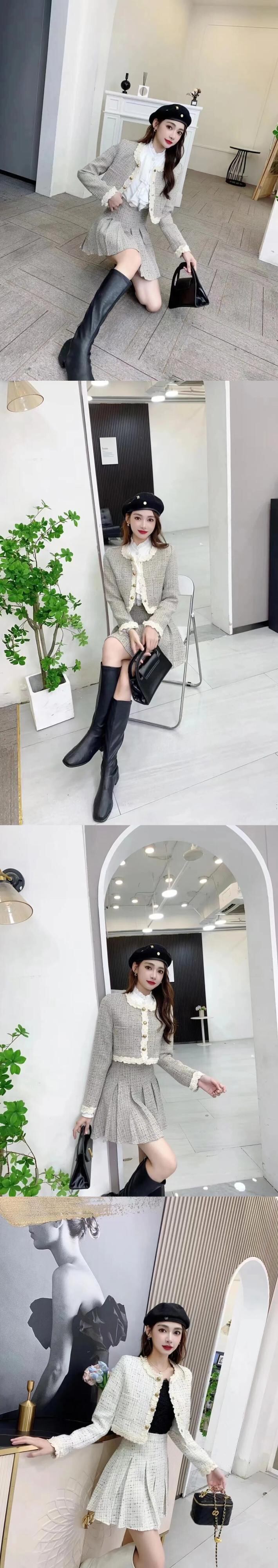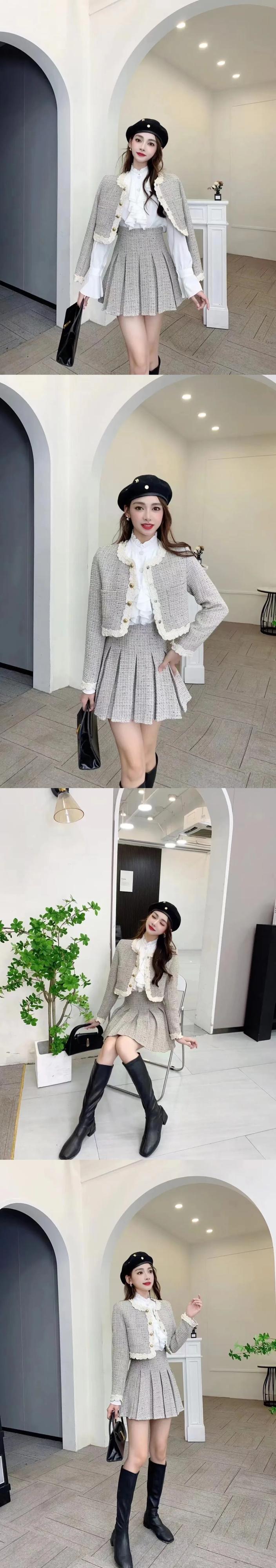 秋冬スイートツイード 2 点セットショートジャケットコート + プリーツスカートスーツフレンチツーピース衣装 大人ガーリー スウィート キュート カジュアル オータム 秋物 ウィンター 冬物