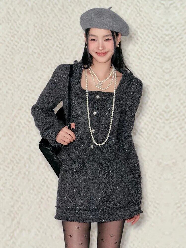 秋冬ストリート高級ツイード 2 点セット衣装ジャケットコート + ショートスカート 2 点セット ウィンター 冬物
