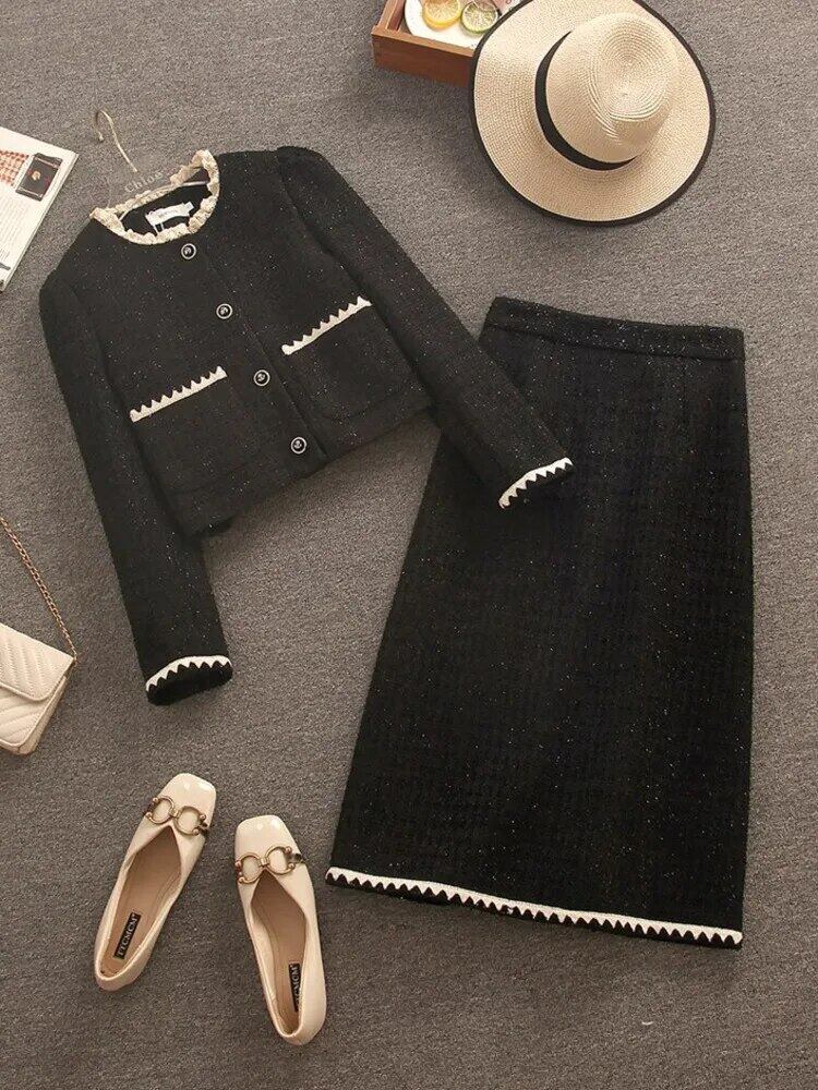 フレンチヘップバーン小さフレグランスツイードツーピースセット秋冬ショートジャケットコート+ロングスカート2ピーススーツ オータム 秋物 ウィンター 冬物