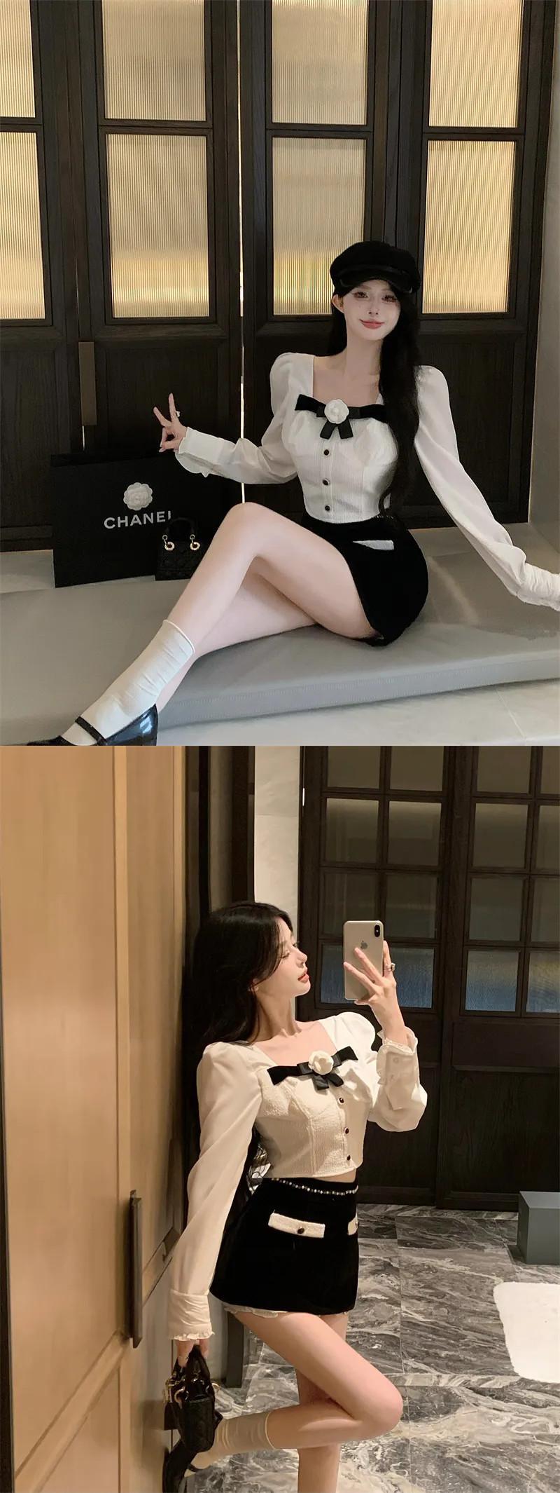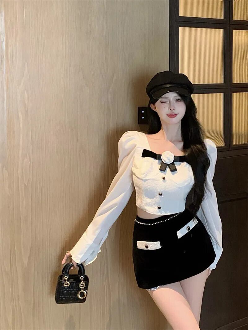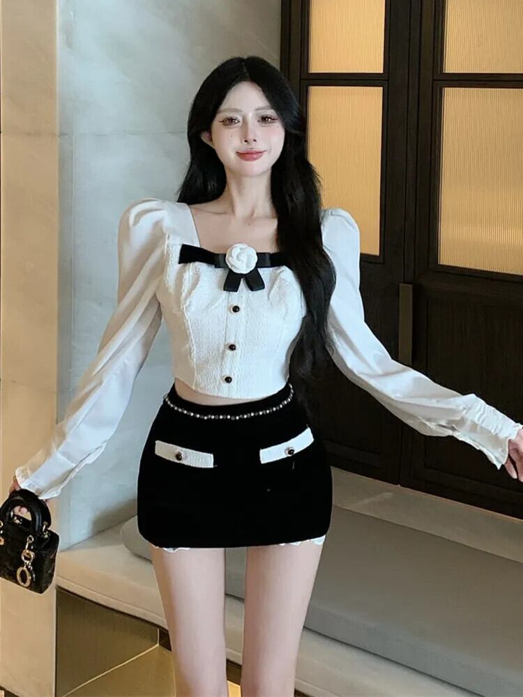 甘い小さ香りツーピースパンツセット長袖カメリアシャツクロップトップ & ビーズベルベットショートセット ロング 大人ガーリー スウィート キュート カジュアル