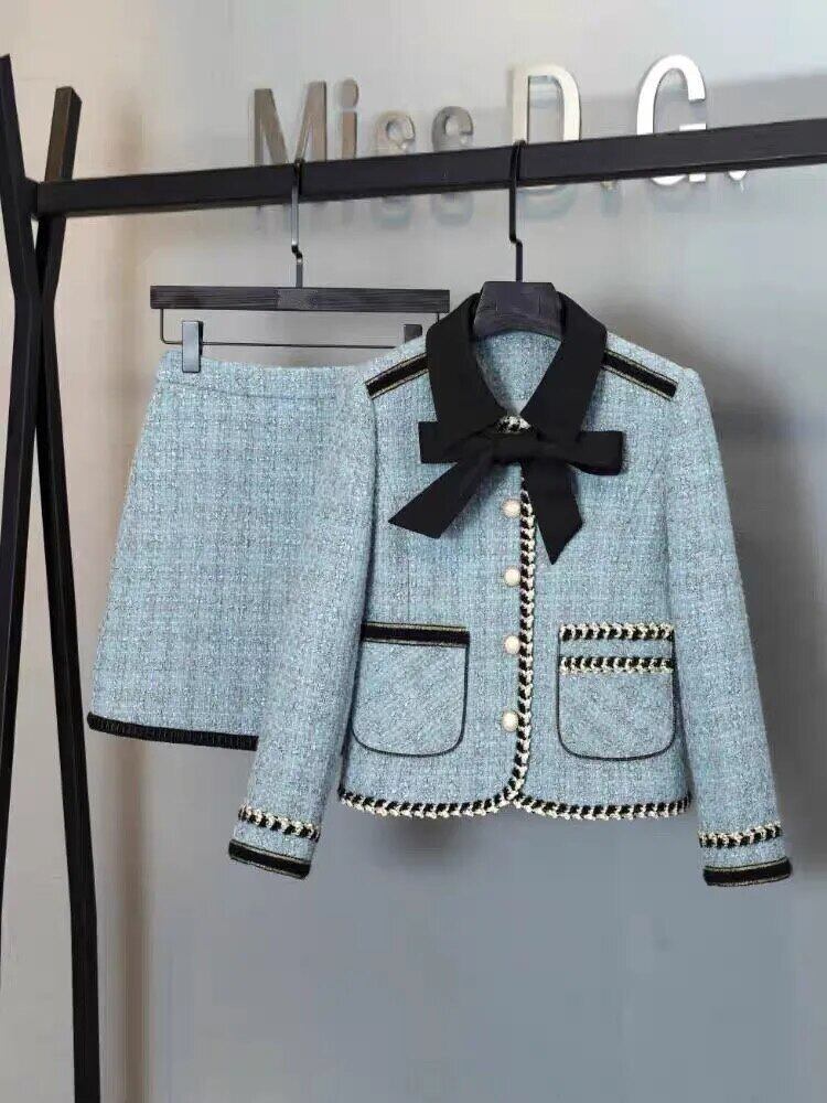 ストリートフレンチスモールフレグランスツイードツーピースセット秋冬ジャケットコート+スカート2ピーススーツ ウィンター 冬物