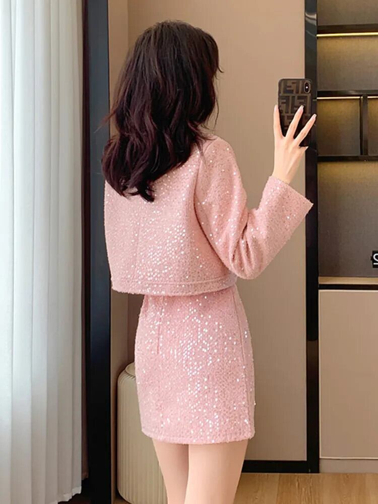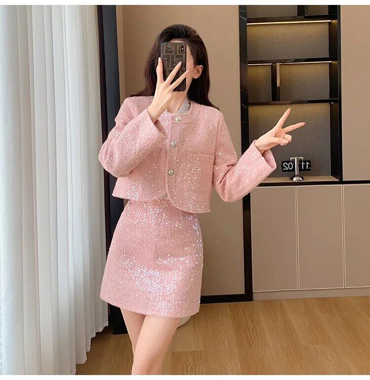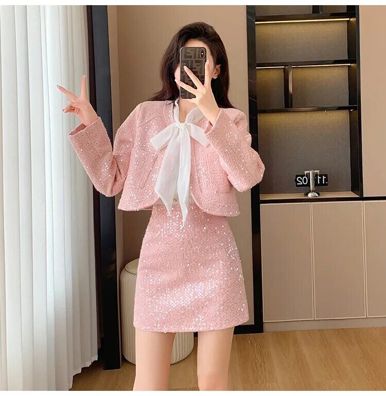 高級スパンコール付き小さ香り良い 2 点セット秋冬甘いショートジャケットコート + スカート 2 点セット 大人ガーリー スウィート キュート カジュアル ウィンター 冬物