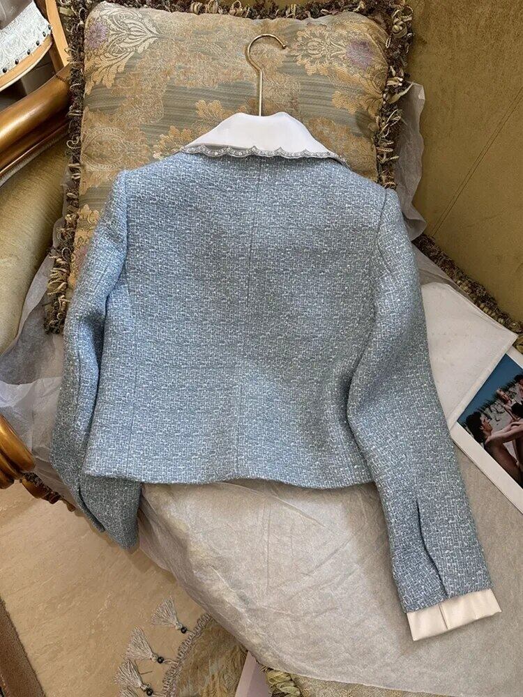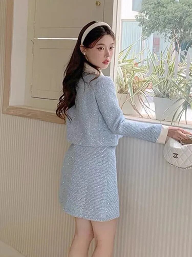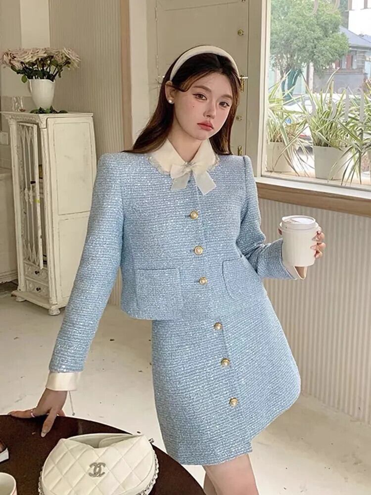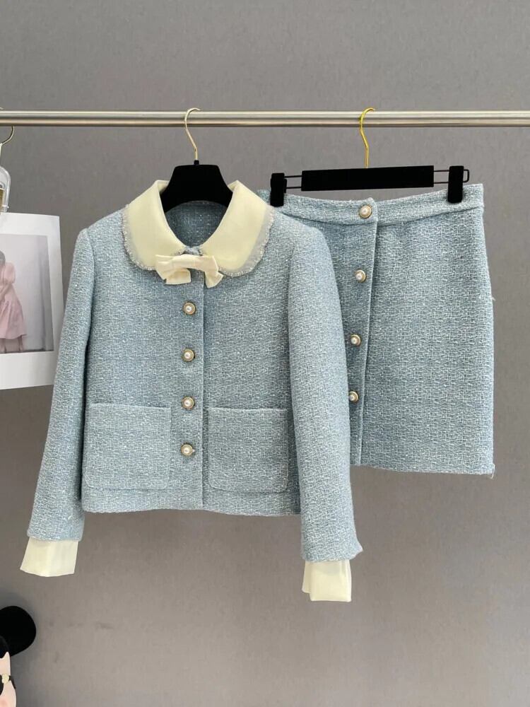 フランス高級ツイード 2 点セット弓ショートジャケットコート + スカートセット甘い 2 ピーススーツ リボン 大人ガーリー スウィート キュート カジュアル