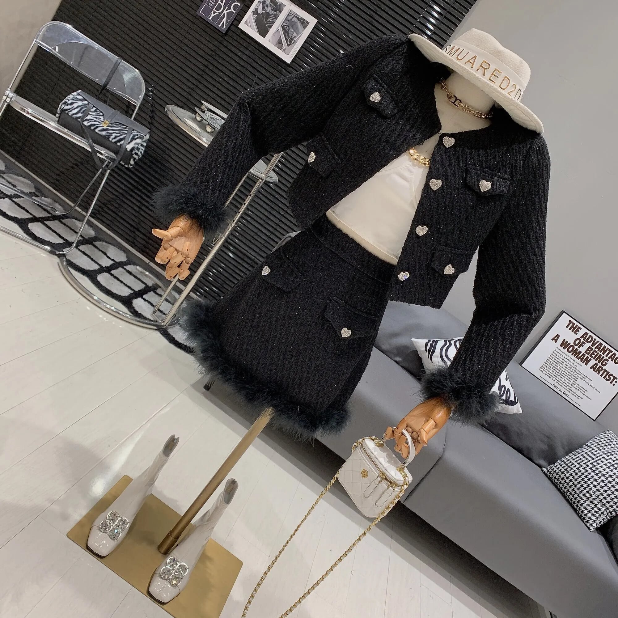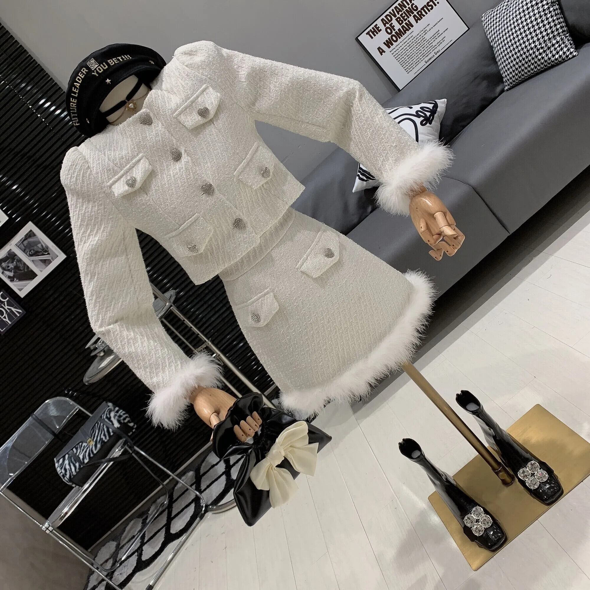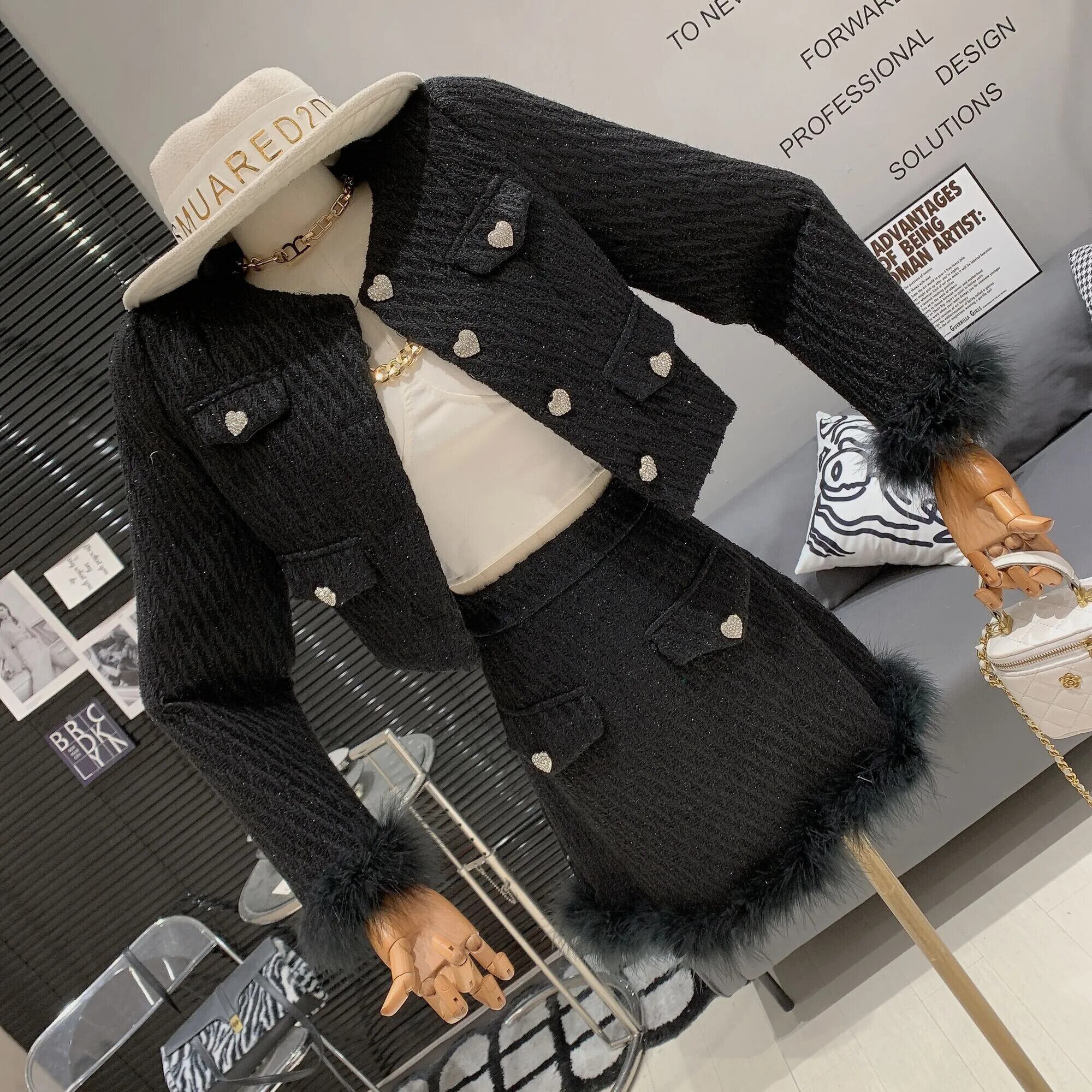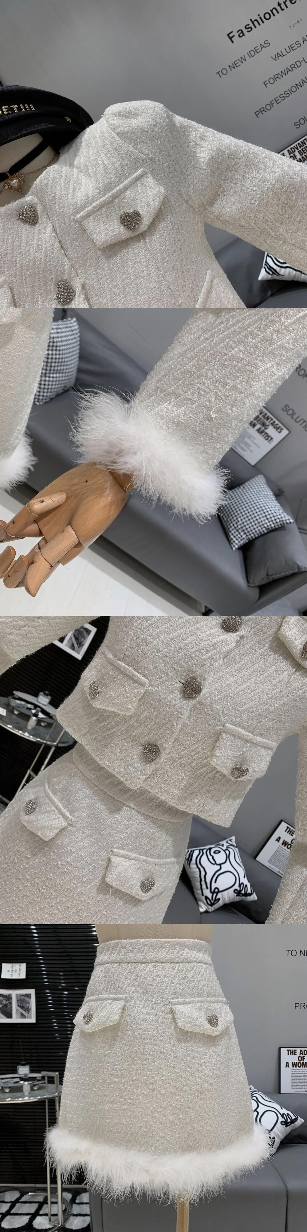 ストリートフレンチツイードツーピースセット高級ダイヤモンドボタンショートジャケットコート+ミニスカート2ピーススーツ