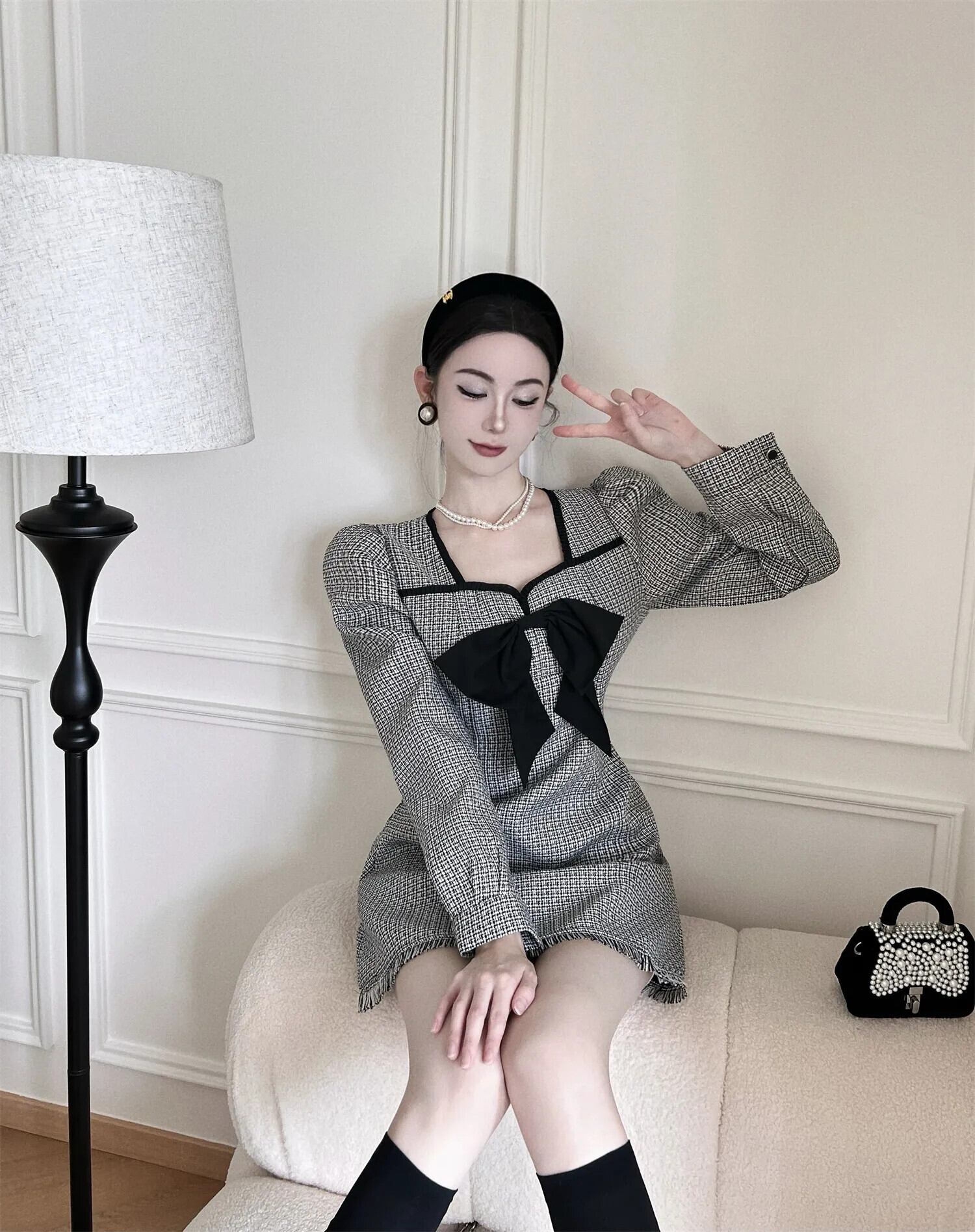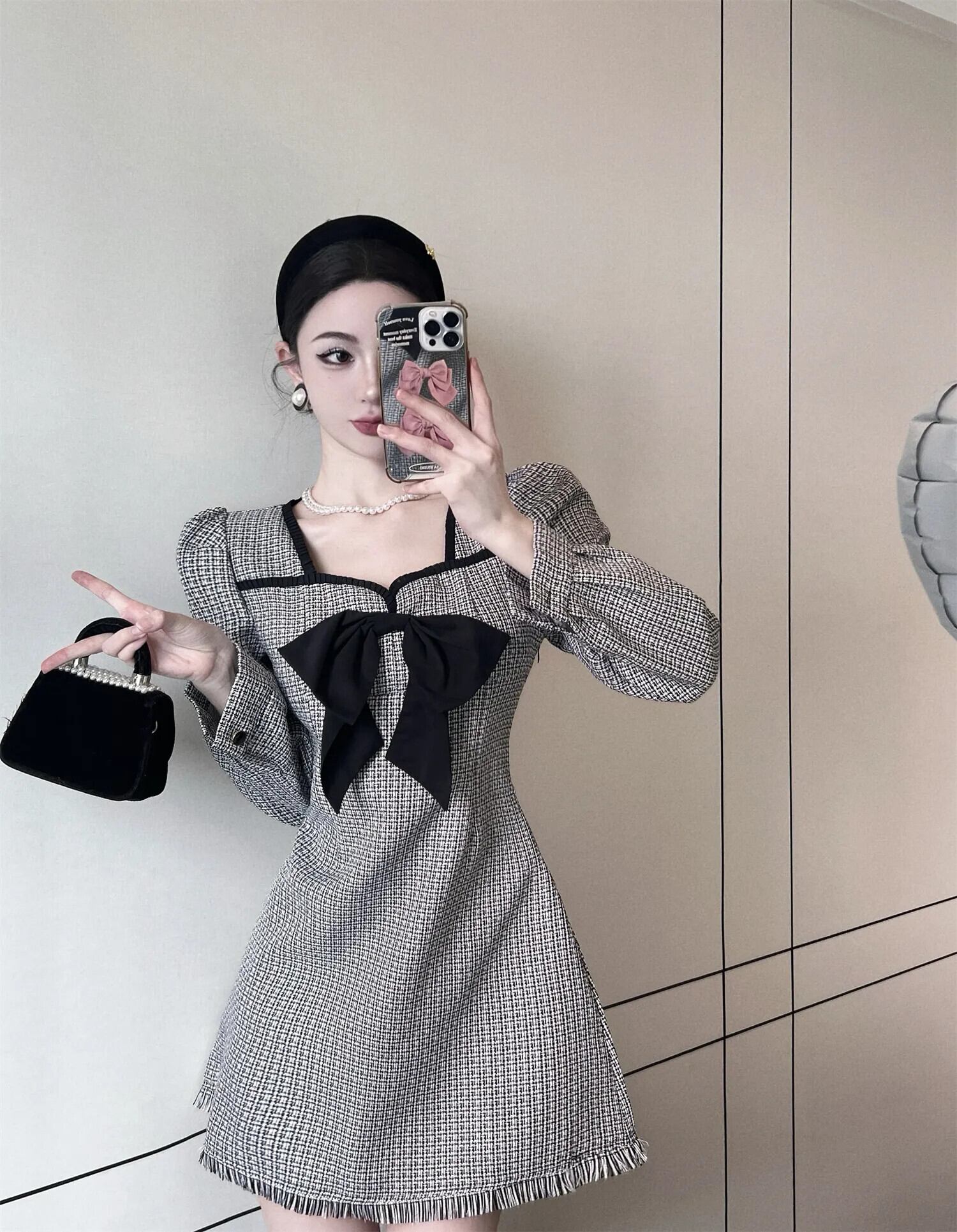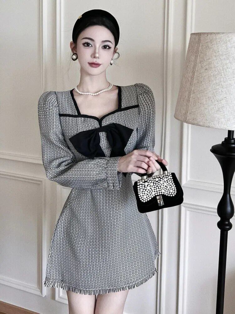 フランス小さフレグランススクエアネックリボンミニドレス秋甘いパーティードレス Vestido Feminino 大人ガーリー スウィート キュート カジュアル オータム 秋物 スクウェア