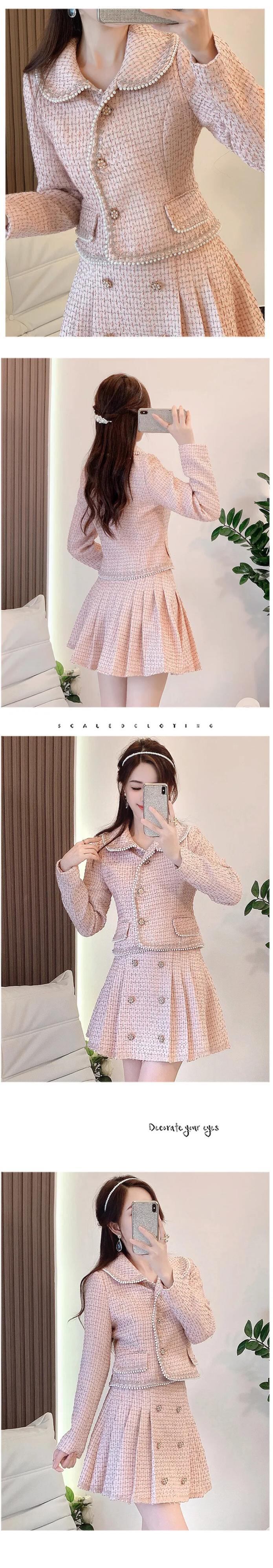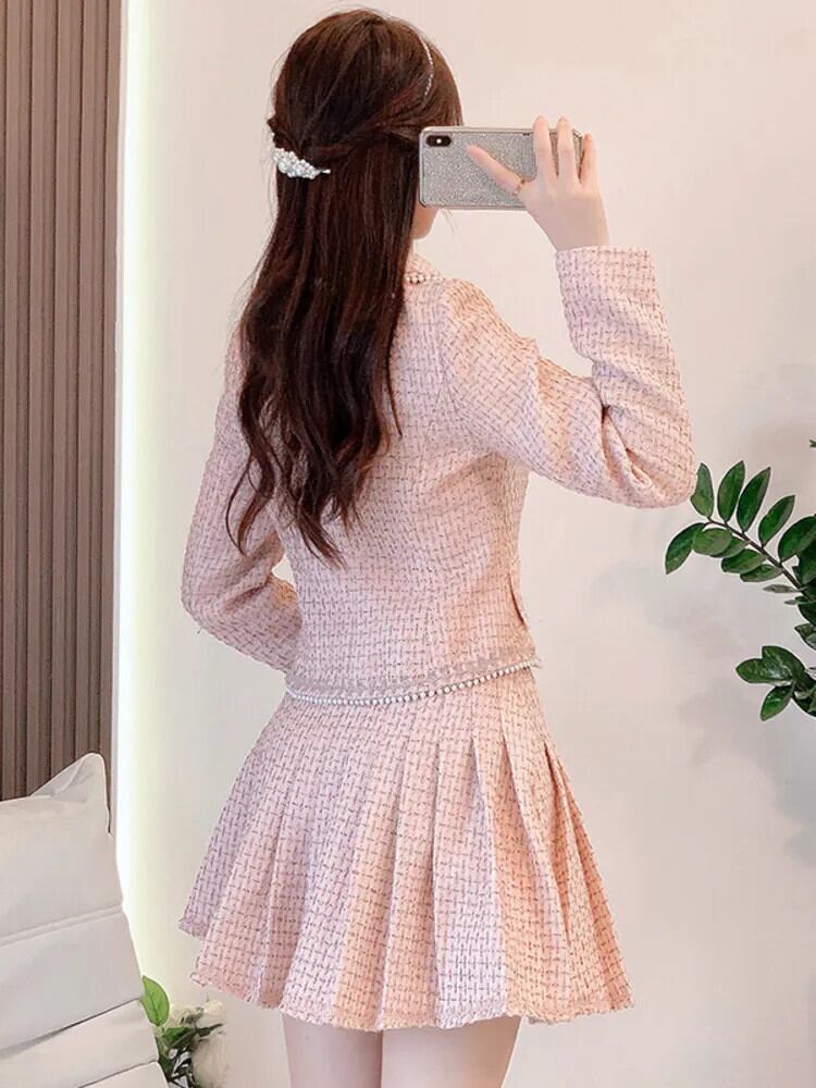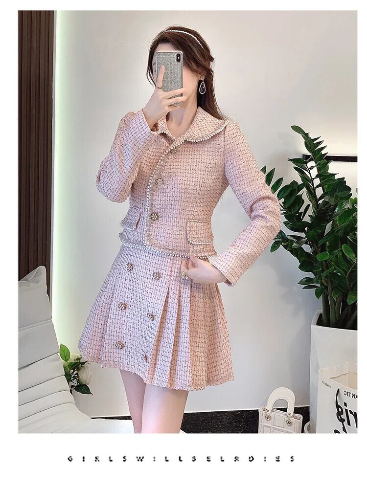 ビーズ小さフレグランツイード 2 点セットショートジャケットコート + スカートセット甘い 2 ピーススーツ 大人ガーリー スウィート キュート カジュアル