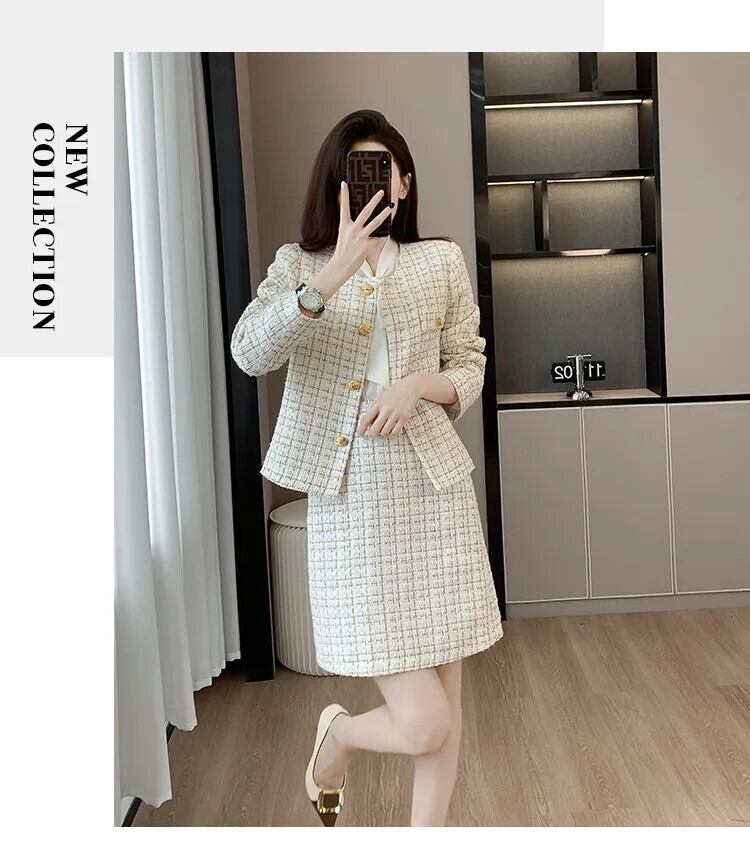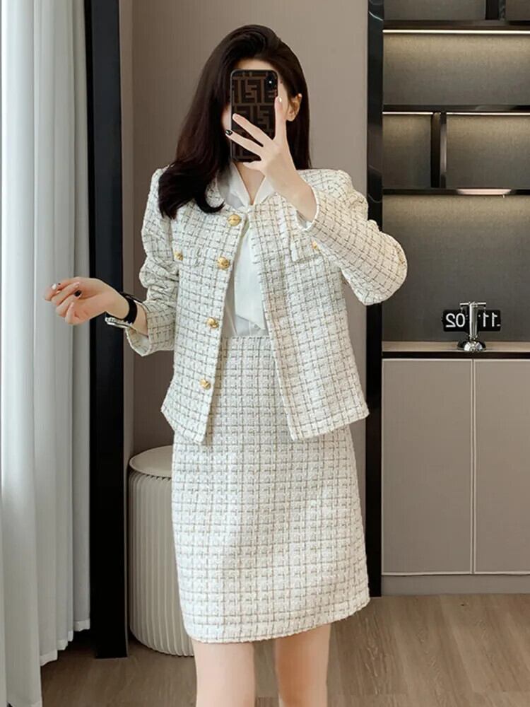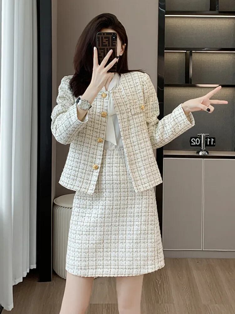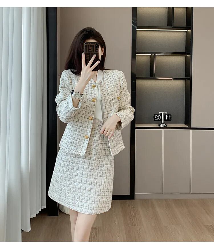 フレンチスモールフレグランスツイードツーピースセットジャケットコート+スカートセットOLツーピーススーツ