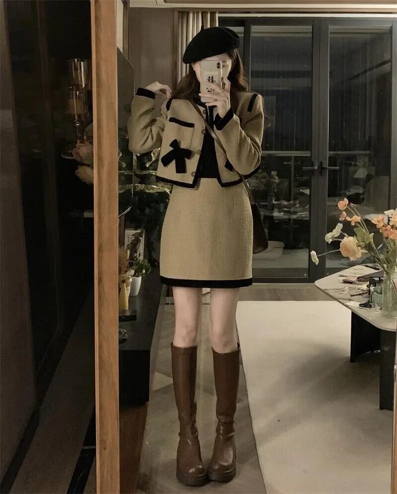 秋冬スモールフレグランスツーピースセットレディースツイードジャケットコート+スカートスーツ2点衣装 オータム 秋物 ウィンター 冬物
