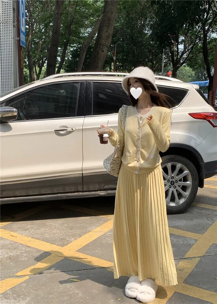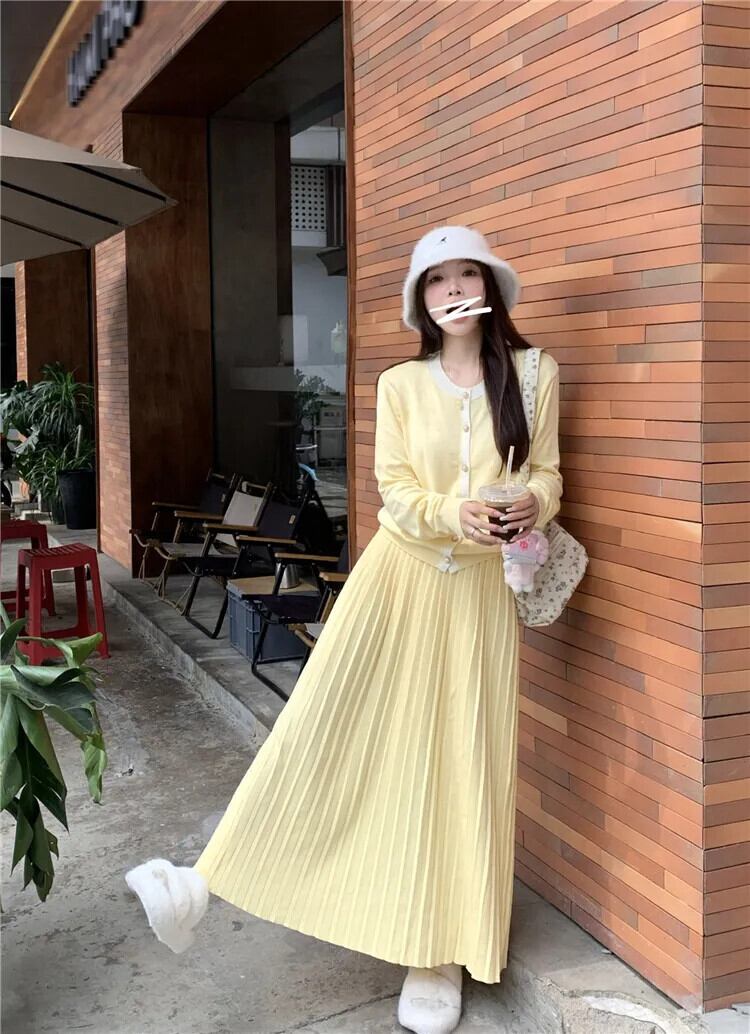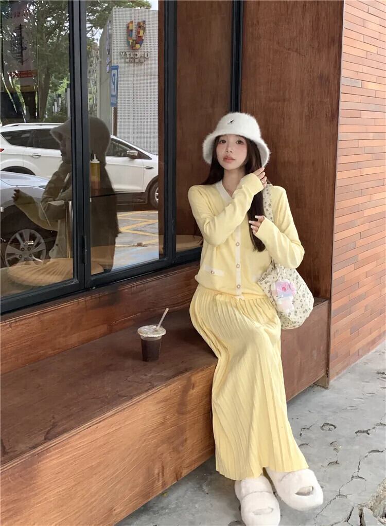 甘いニット 2 点セットセーターカーディガンコート + プリーツロングスカートスーツ秋冬ツーピース衣装 大人ガーリー スウィート キュート カジュアル オータム 秋物 ウィンター 冬物