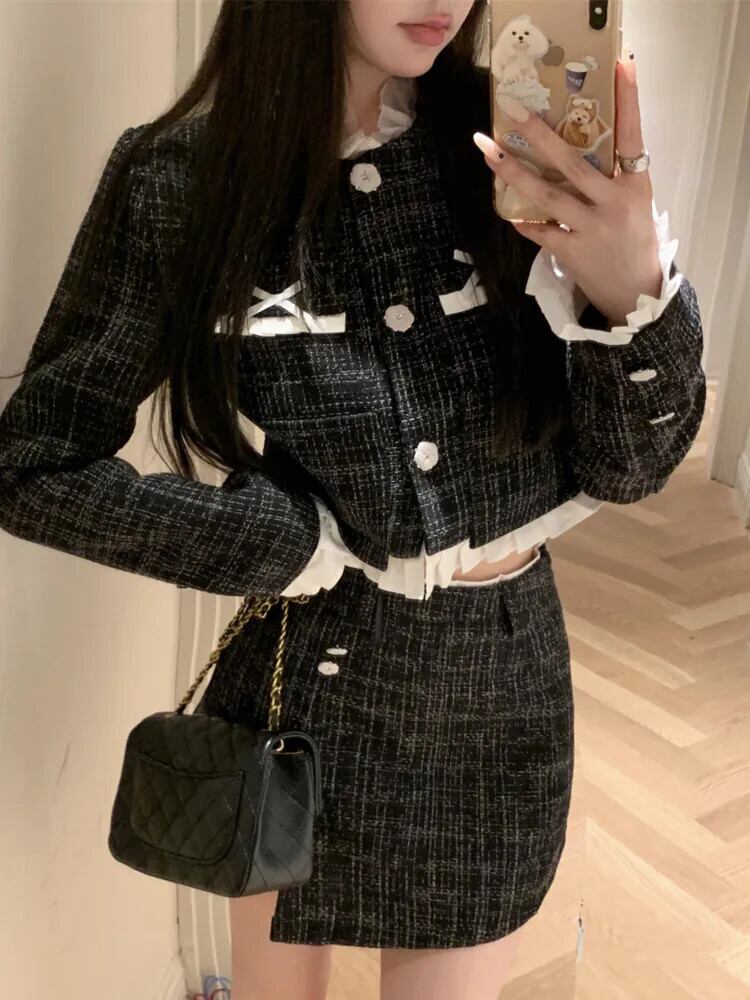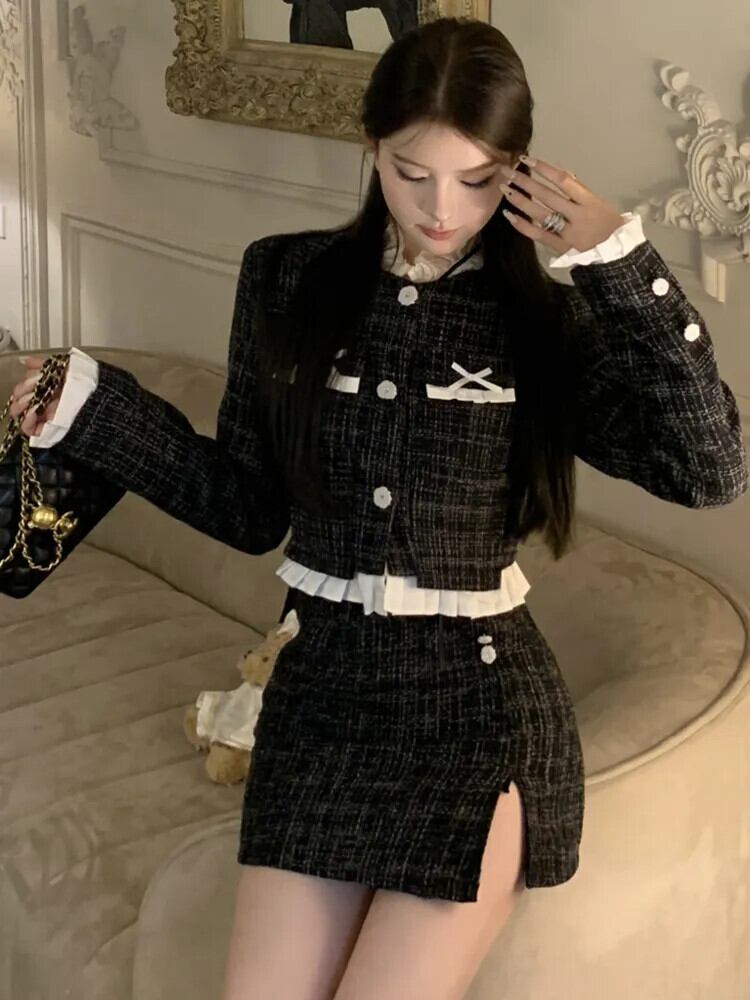 秋冬スイートツイード 2 点セットボウジャケットコート + スカート 2 点セット衣装 リボン 大人ガーリー スウィート キュート カジュアル オータム 秋物 ウィンター 冬物