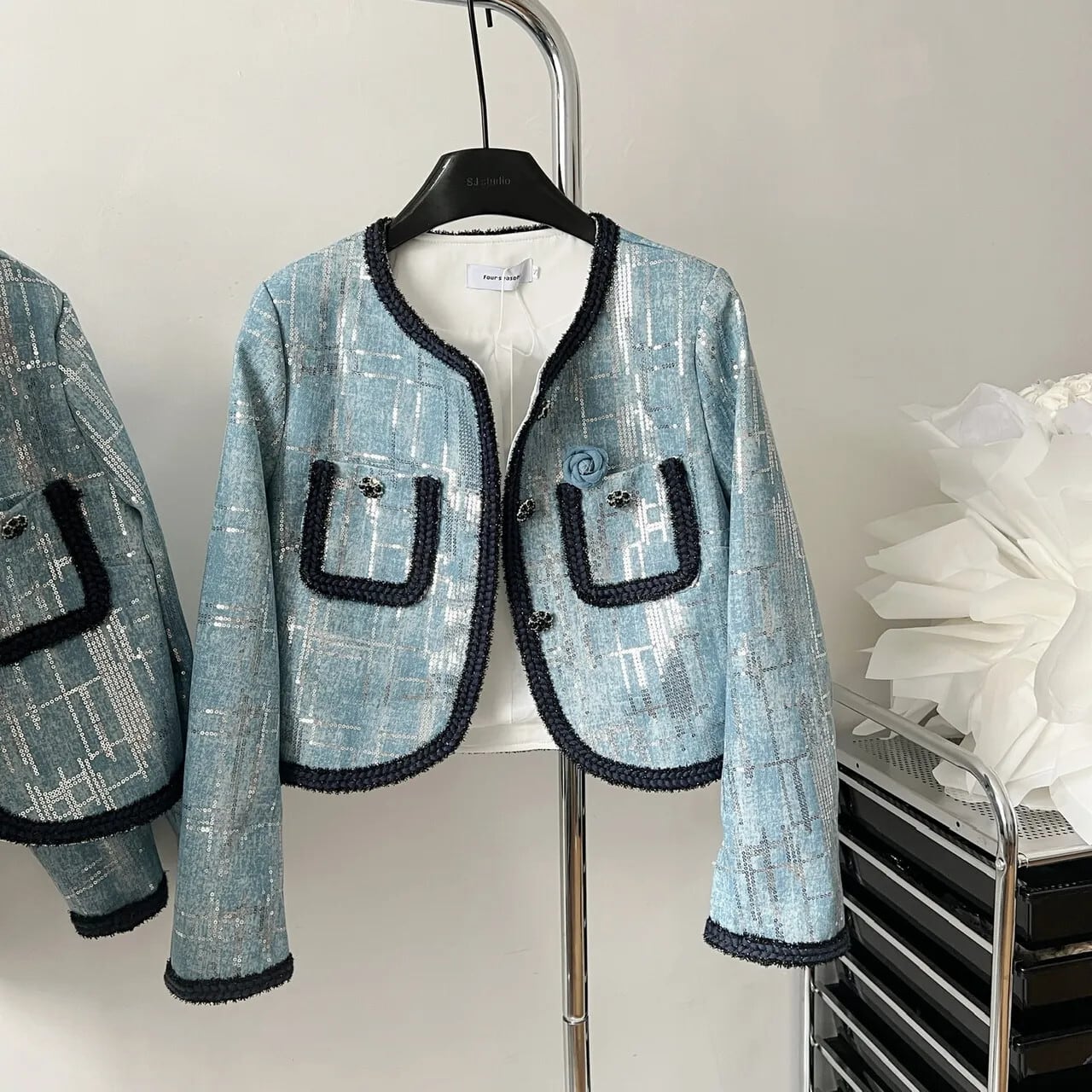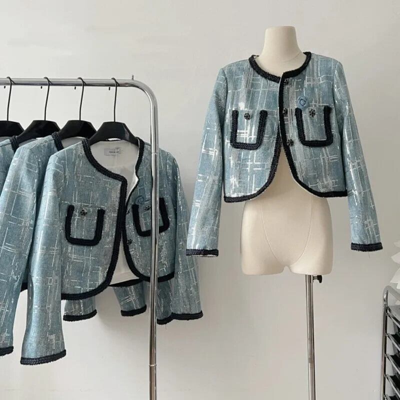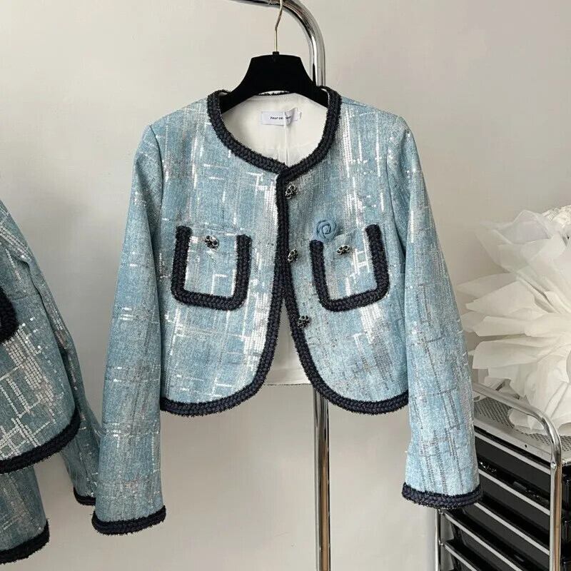 秋小さ香り高級スパンコールデニムショートジャケット Y2K フライドストリートコートアウター Jaqueta オータム 秋物