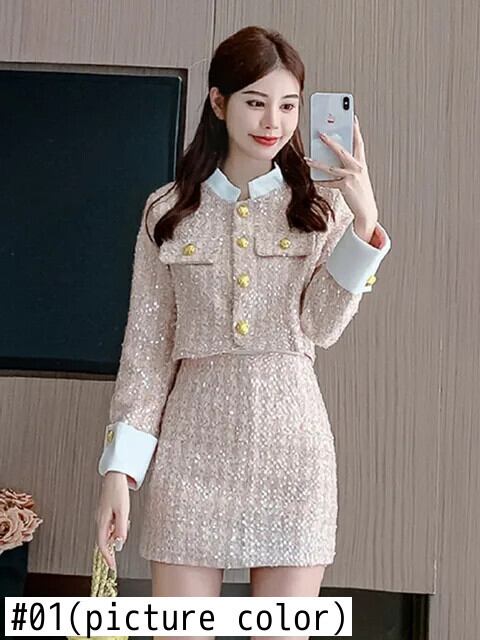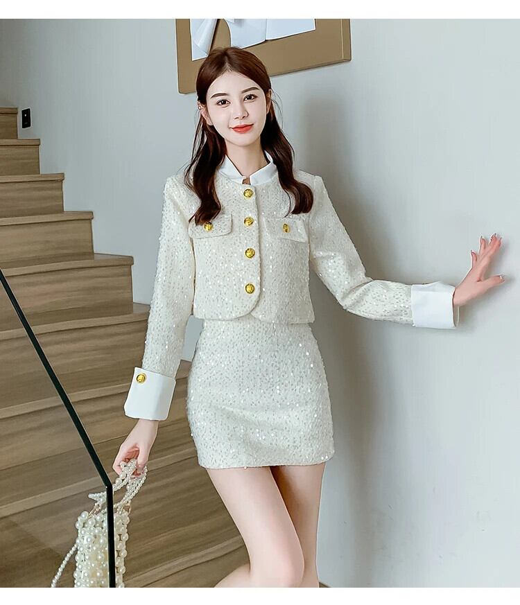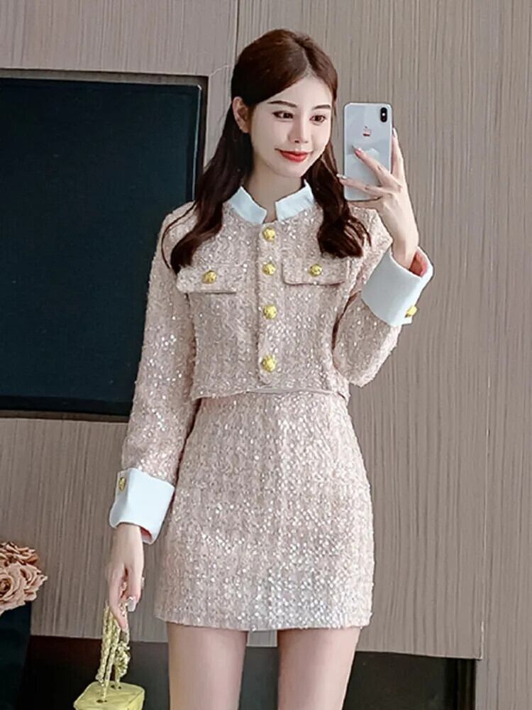 ストリート Y2K フレンチ高級スパンコールツイード 2 点セットジャケットコート + スカートスーツ小さ香り 2 点セット