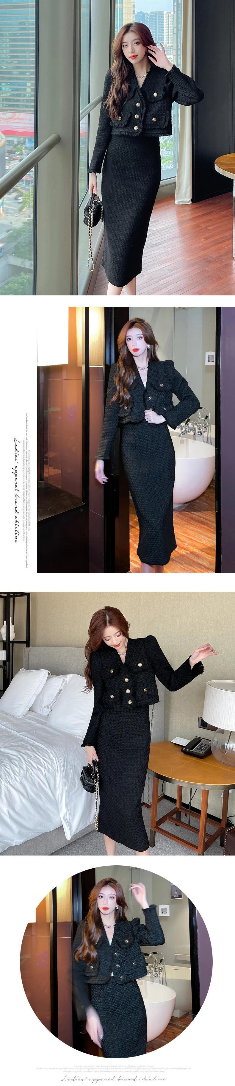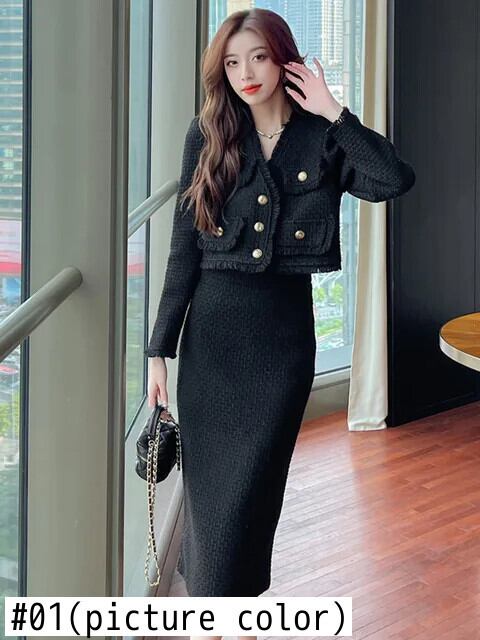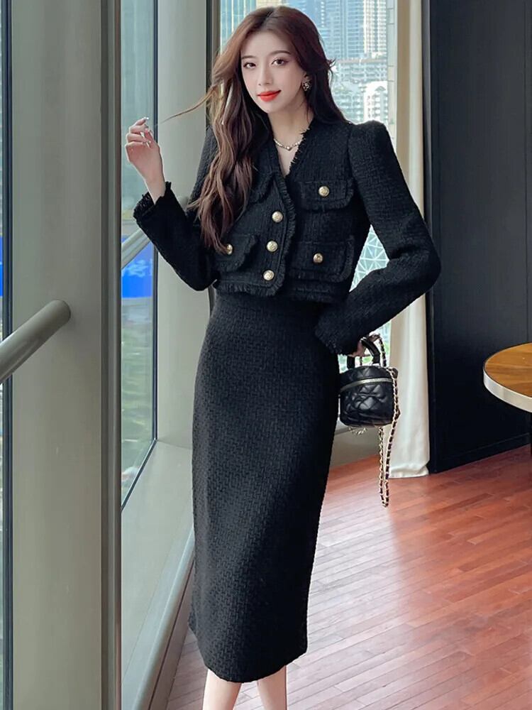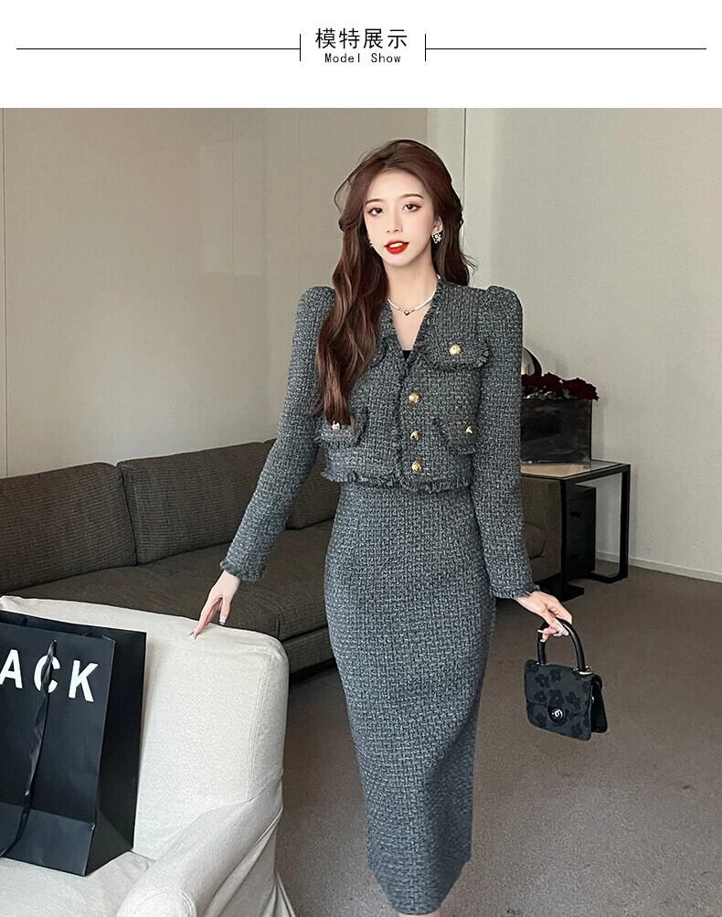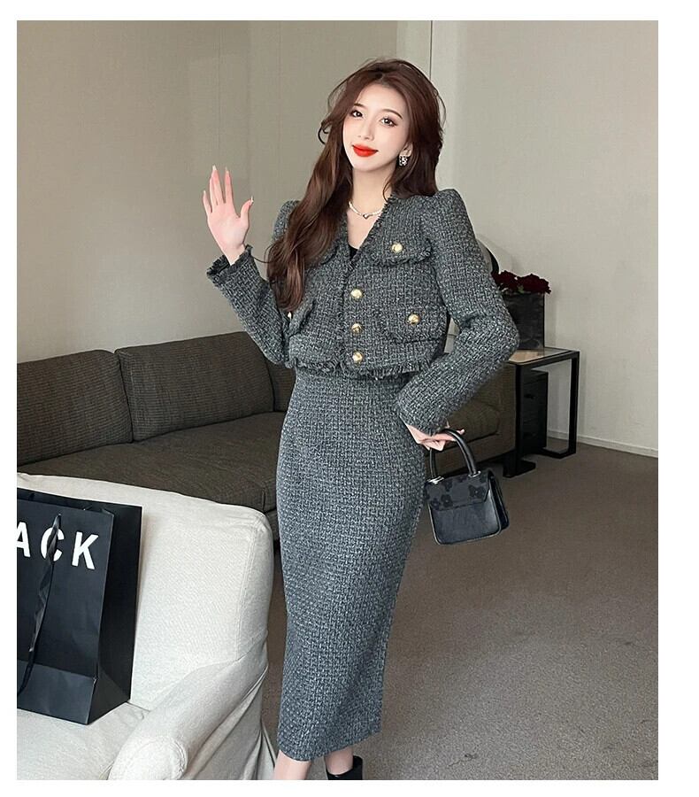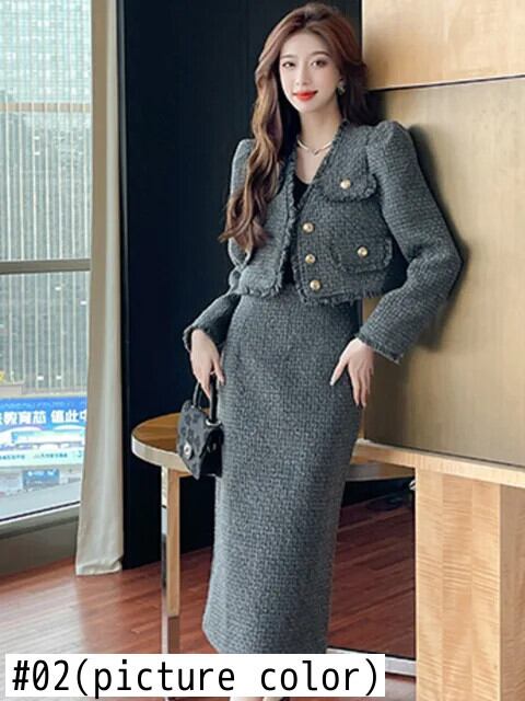秋冬フレンチツイードツーピースセットショートジャケットコート+ロングスカートセット2ピーススーツ オータム 秋物 ウィンター 冬物