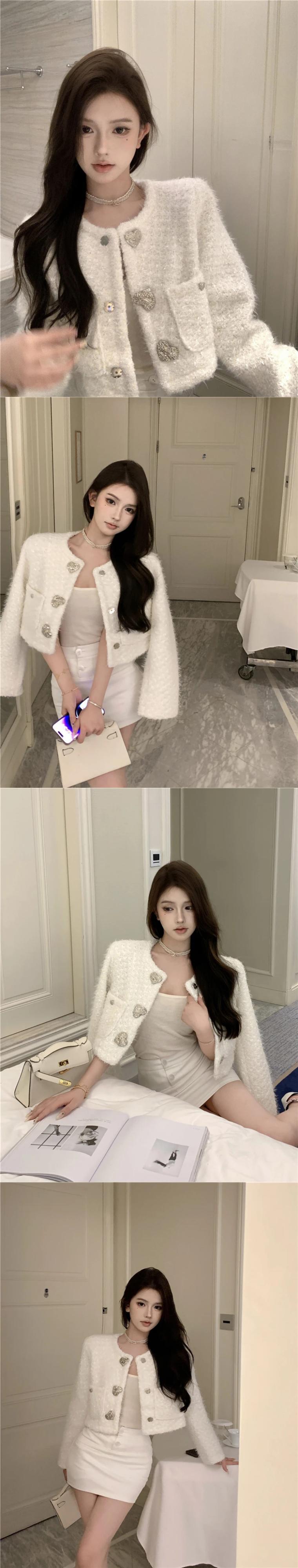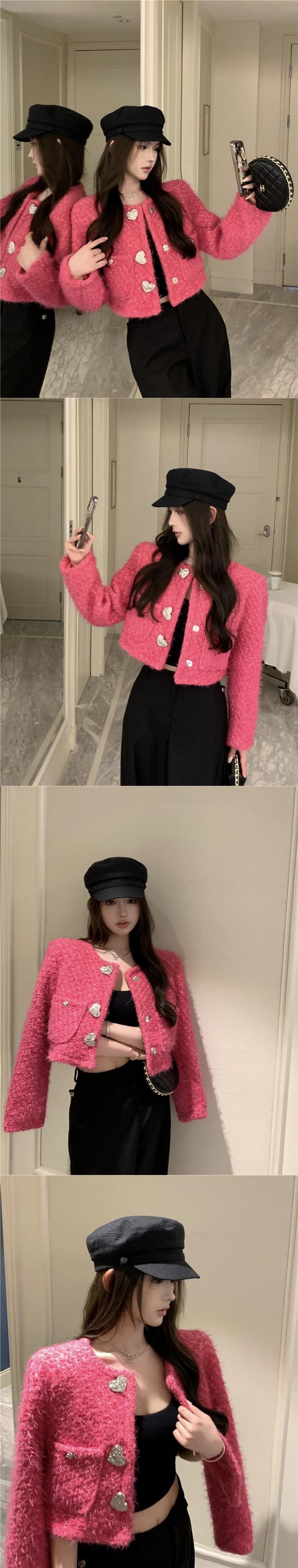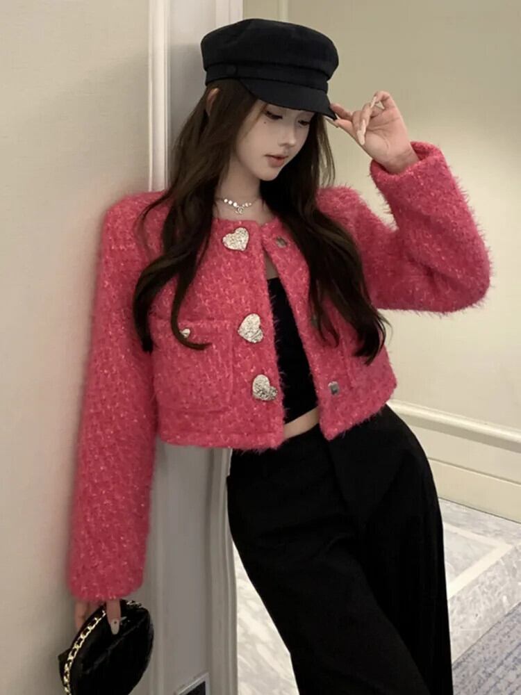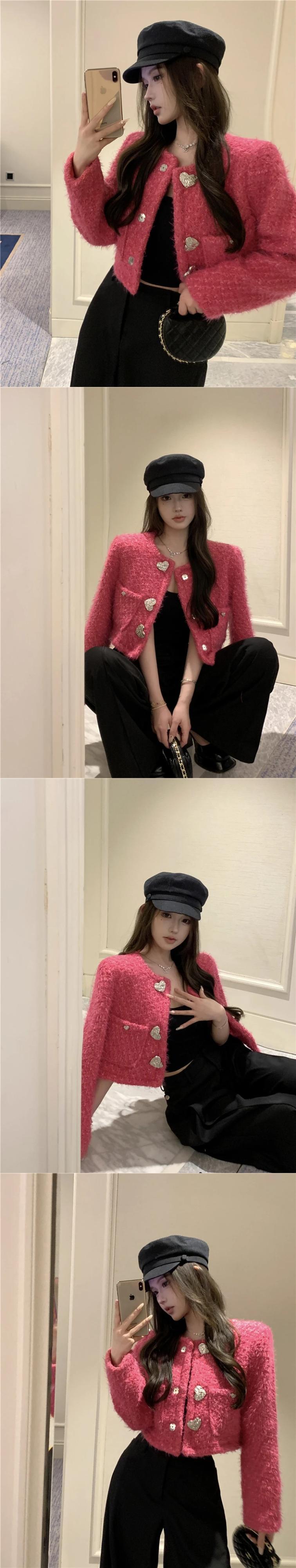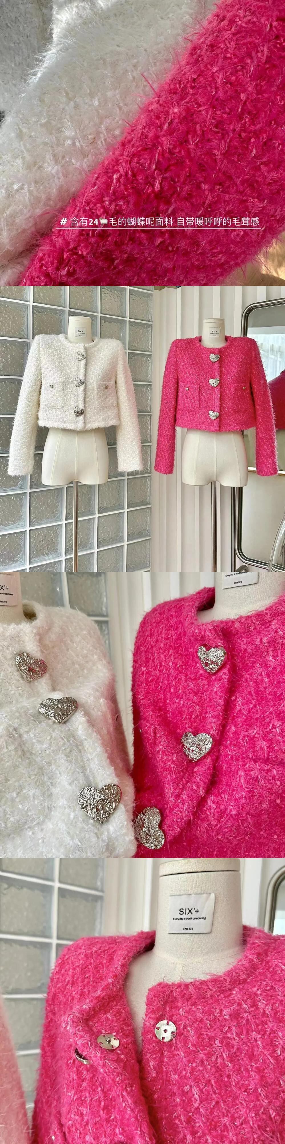ガールスイートピーチハートボタンショートジャケット秋冬小さ香りコートアウタートップス 大人ガーリー スウィート キュート カジュアル オータム 秋物 ウィンター 冬物