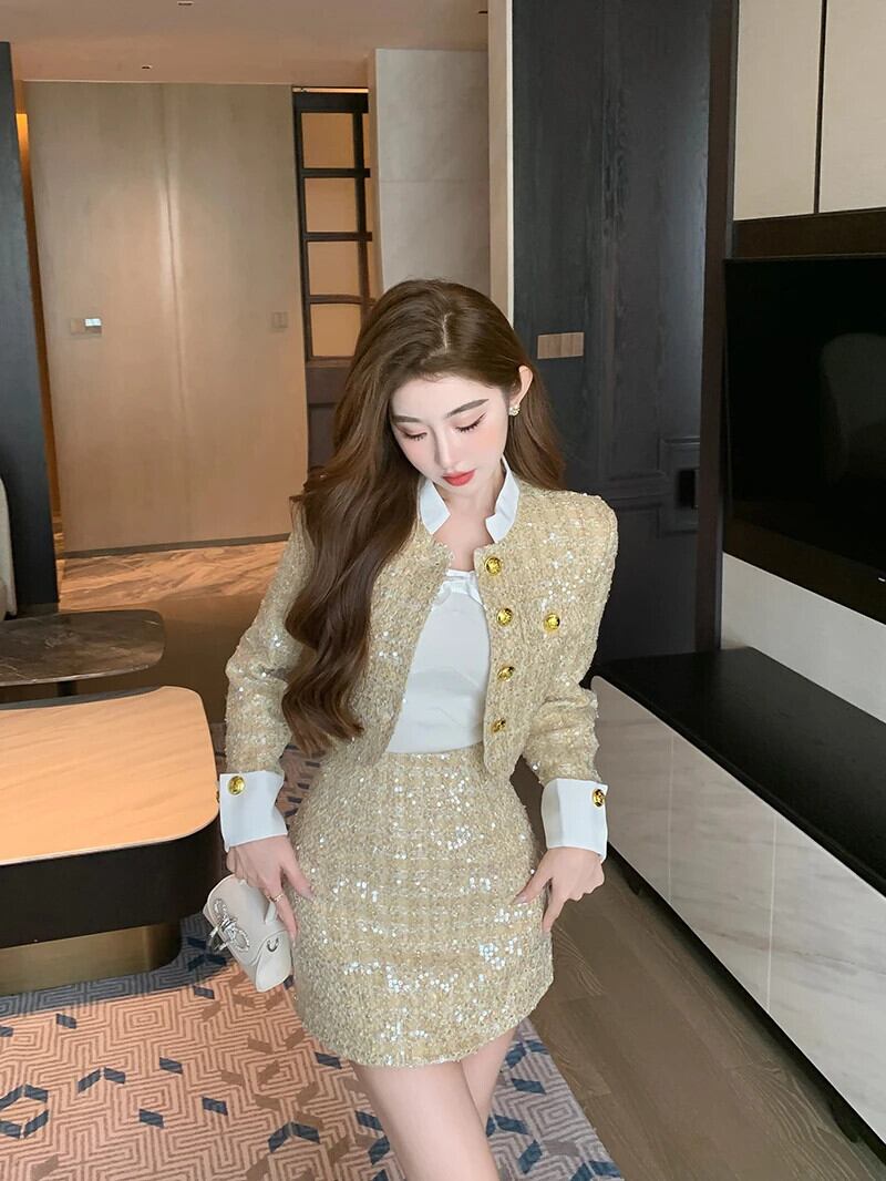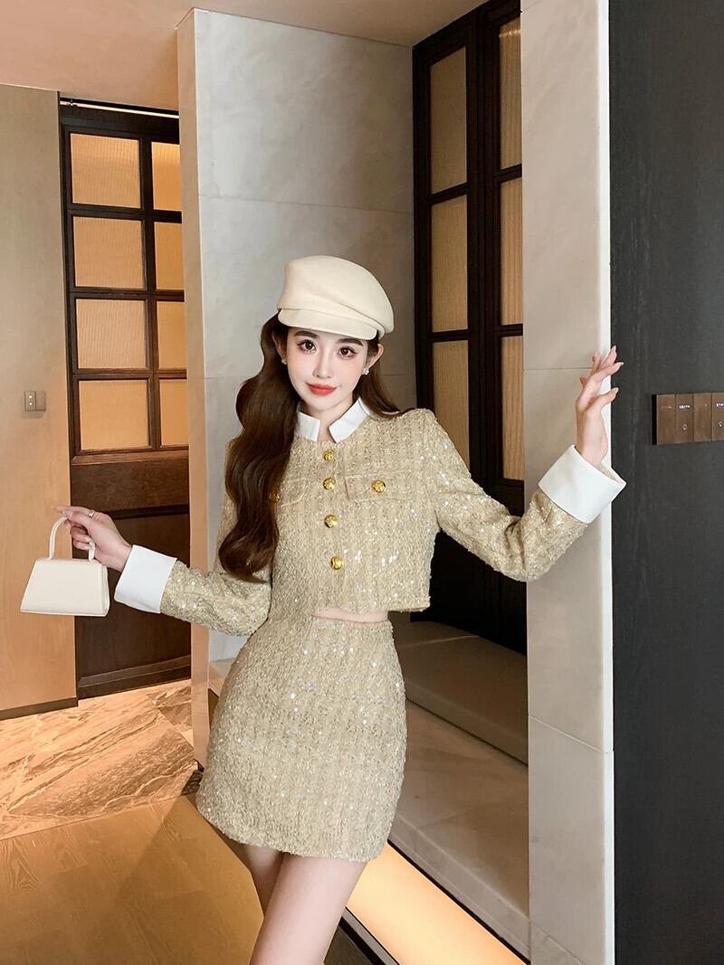 ストリートフレンチスモールフレグランスツーピースセット高級スパンコールショートジャケットコート+ミニスカートセット2ピーススーツ