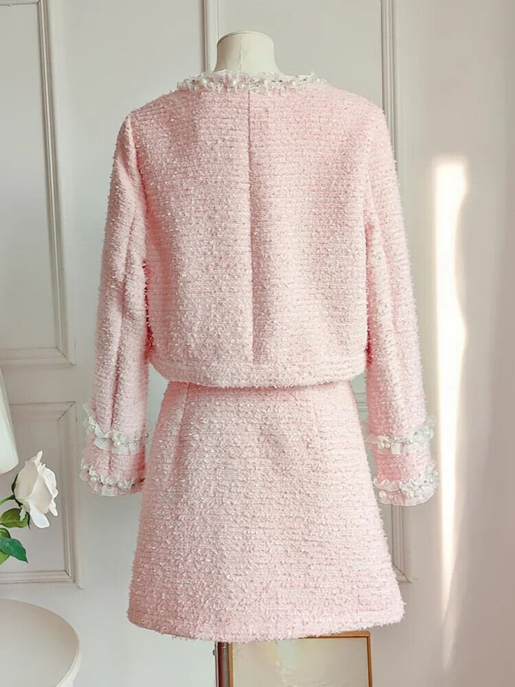 ガールスウィートピンクパールビーズツイードツーピースセットショートジャケットコート+スカートスーツ小さ香り2ピース衣装 大人ガーリー キュート カジュアル 真珠