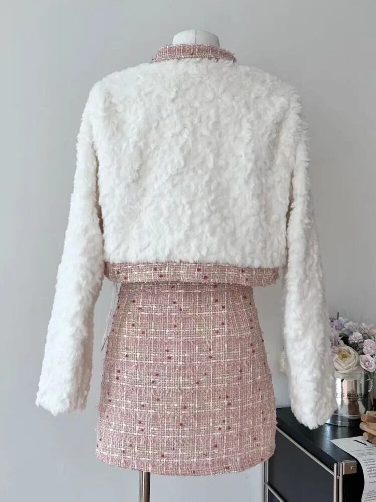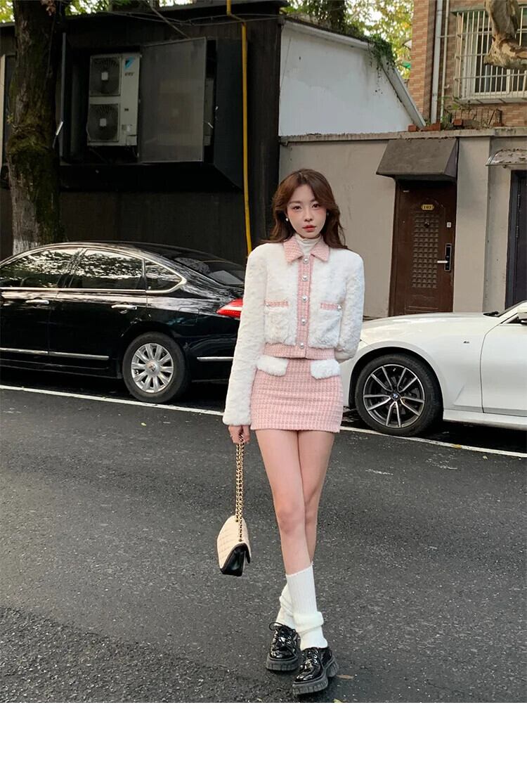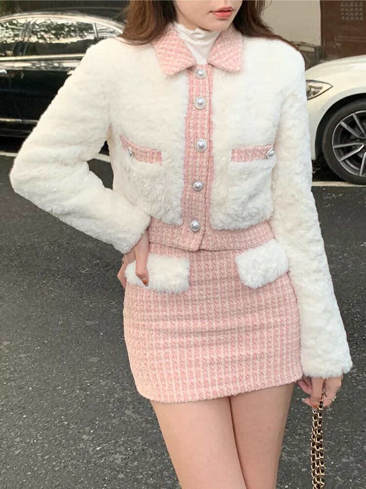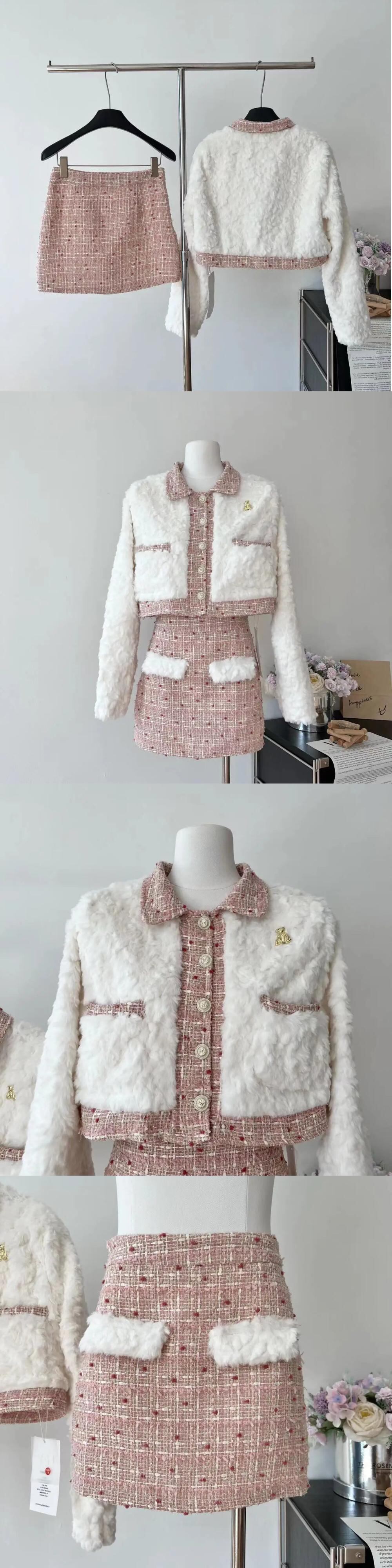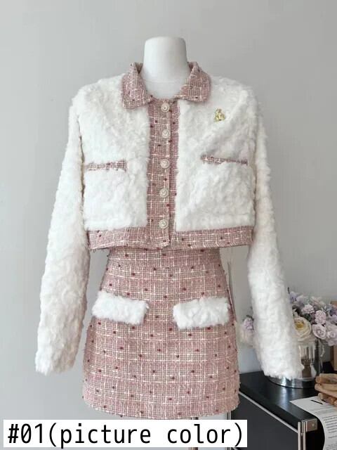 甘いガールソフト小さ香り 2 点セット冬暖かいフェイクファージャケットコート + スカート 2 点セット衣装 大人ガーリー スウィート キュート カジュアル ウィンター 冬物