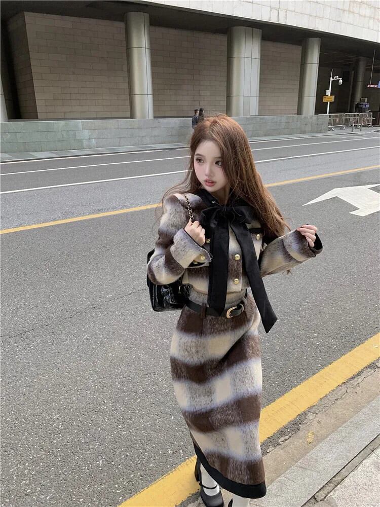冬フランス小さ香りツーピースセットチェック柄ジャケットコート + スカート 2 点セット衣装 ウィンター 冬物