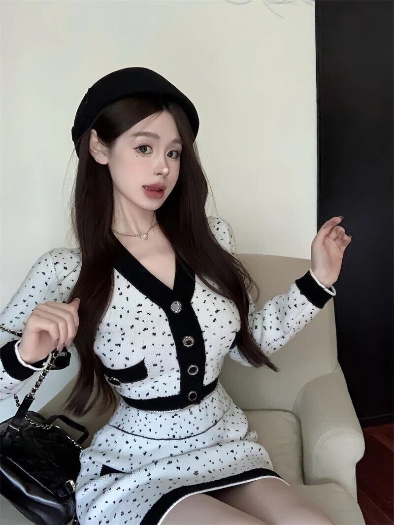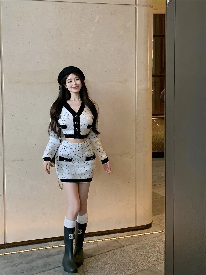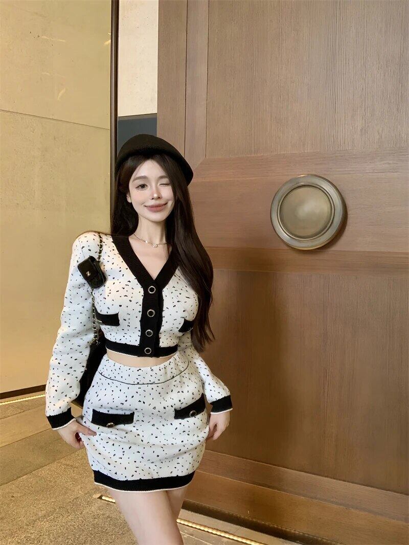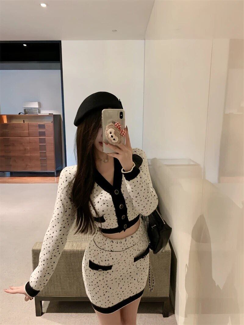 秋フランス小さ香りニット 2 点セットセーターカーディガンクロップトップ + ミニスカート 2 ピース衣装 オータム 秋物