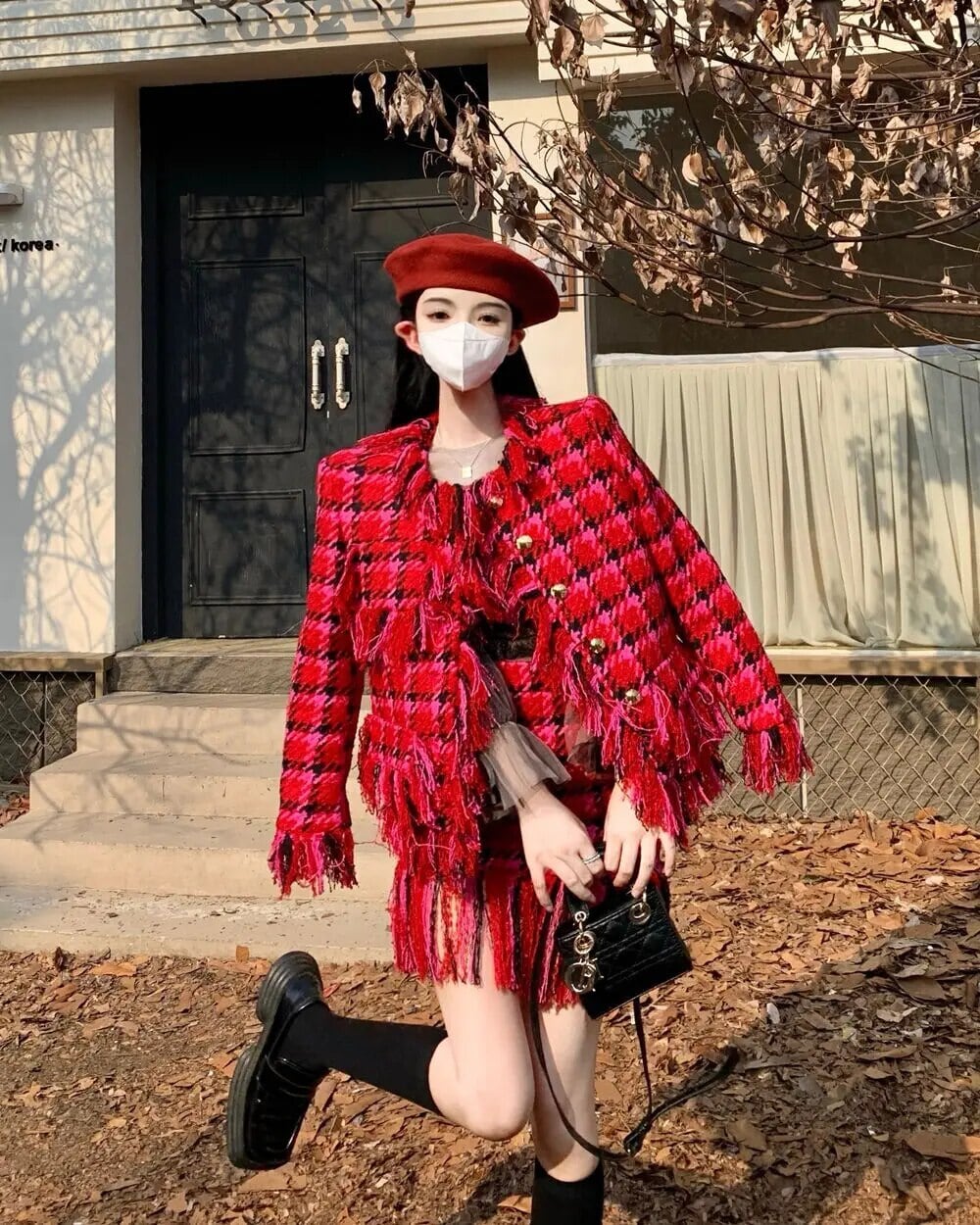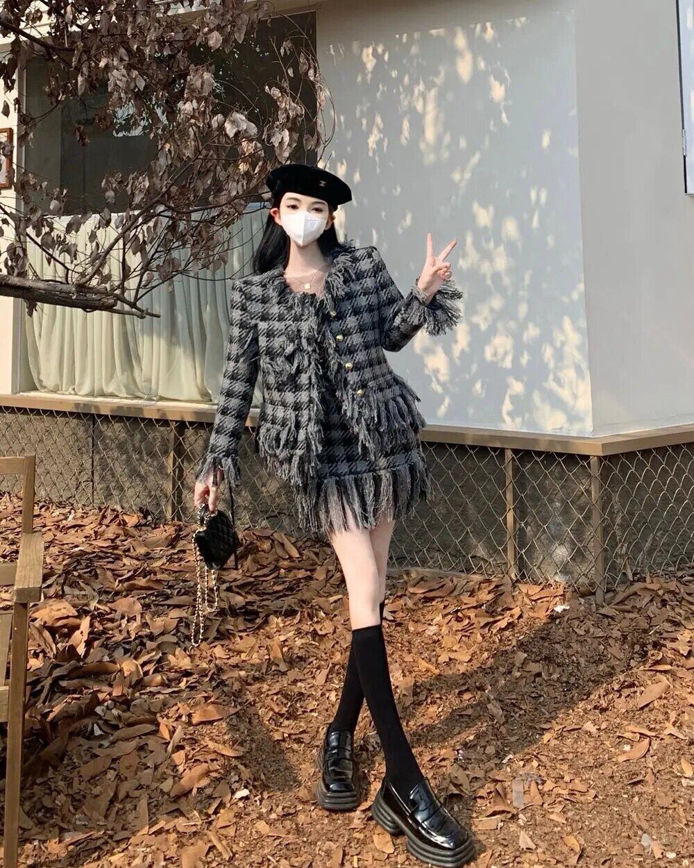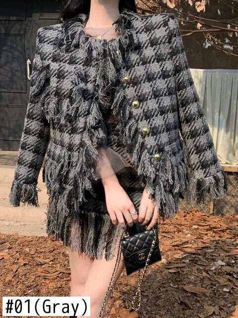 冬フレンチスモールフレグランスフリンジツイードツーピースセットチェック柄ウールジャケットコート+スカート2ピーススーツ ウィンター 冬物