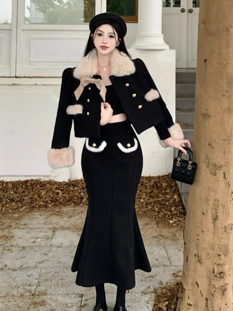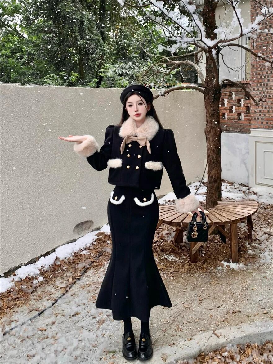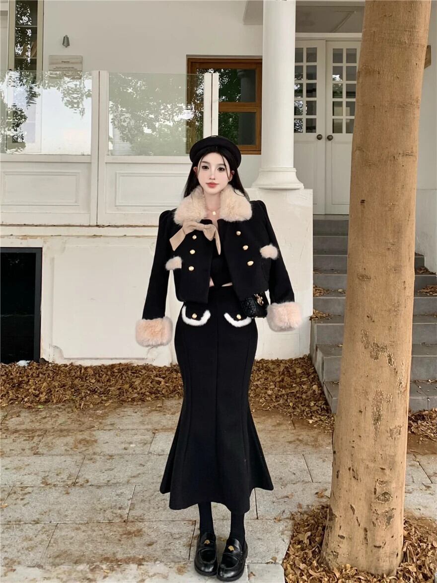 冬 2 点セット衣装甘いフェイクカラージャケットコート & マーメイドロングスカートツーピーススーツ 大人ガーリー スウィート キュート カジュアル ウィンター 冬物 ファー