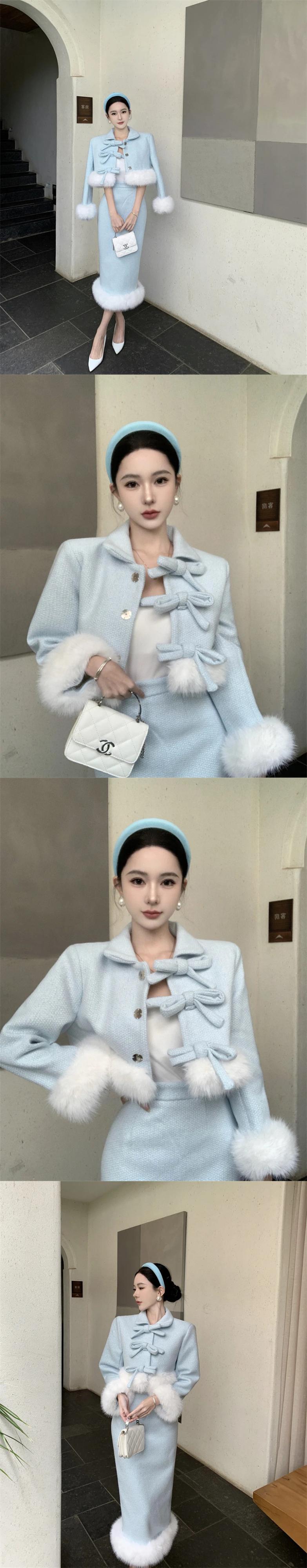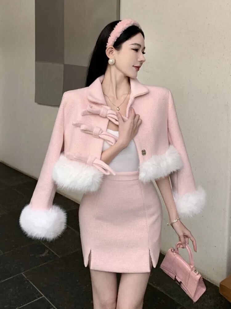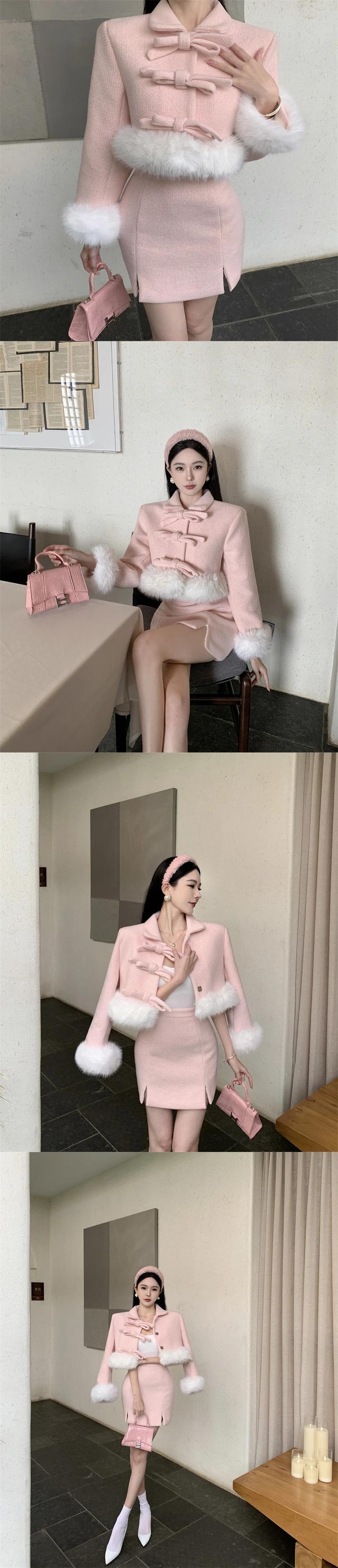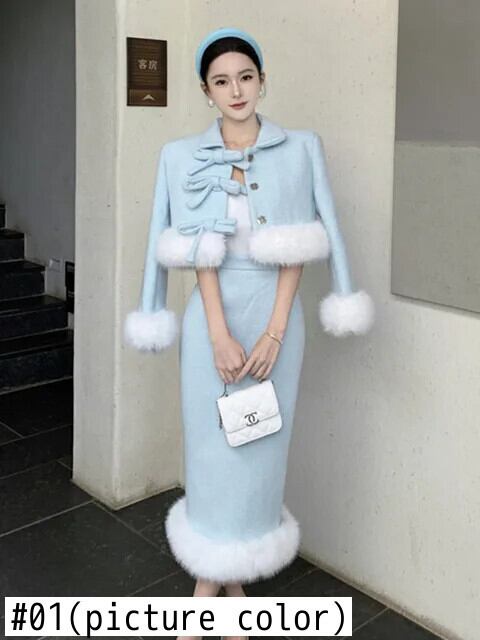 厚く暖かい冬ツーピースセット甘い豪華ショートジャケットコート + スカート 2 点セット 大人ガーリー スウィート キュート カジュアル ウィンター 冬物