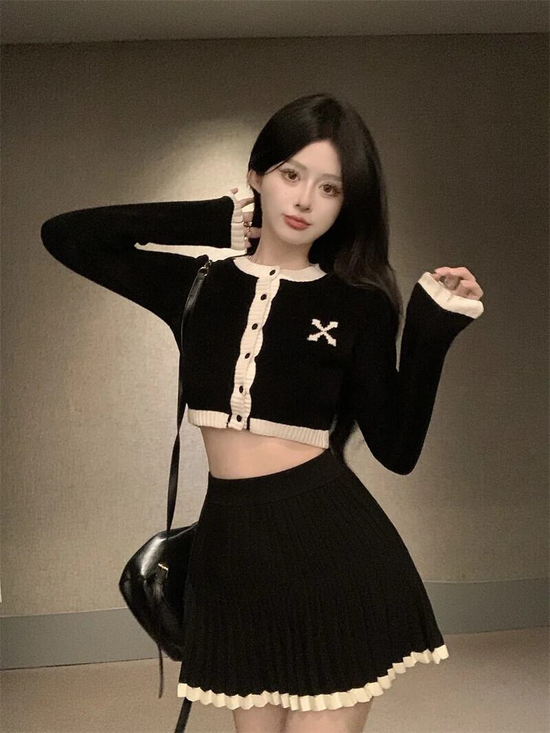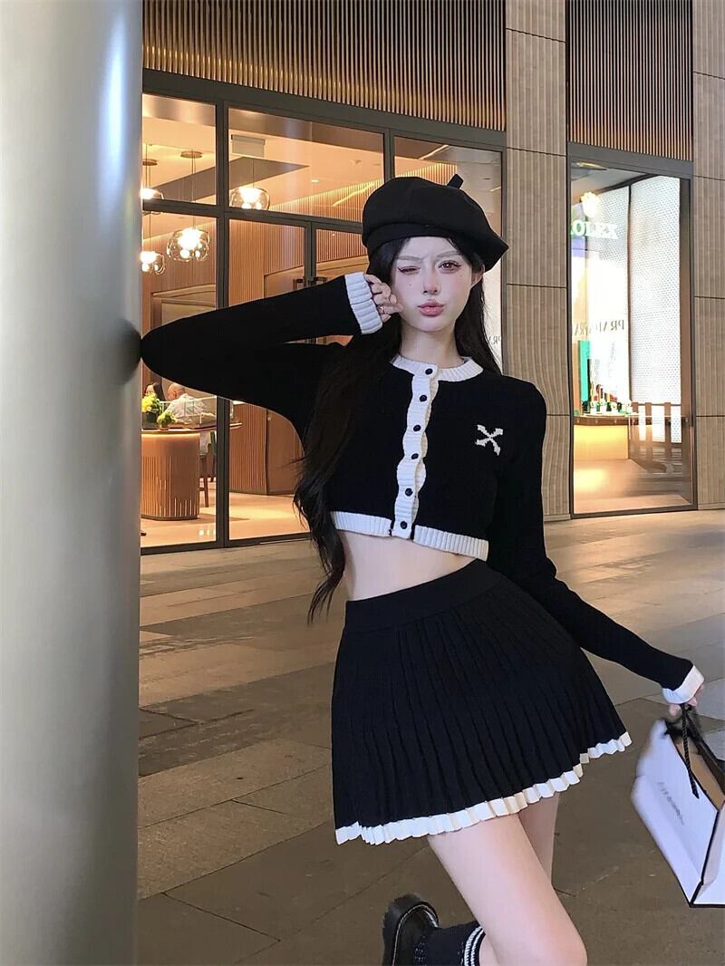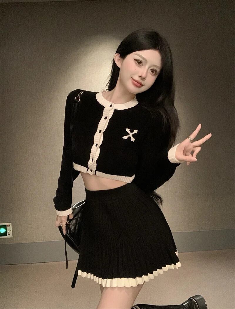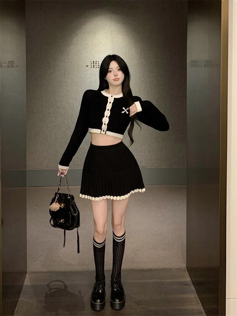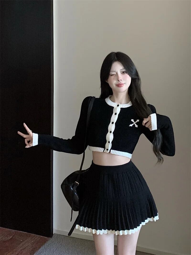 小さ香りニット 2 点セットセーターカーディガンコートクロップトップ + スカートセット甘い 2 ピーススーツ 大人ガーリー スウィート キュート カジュアル