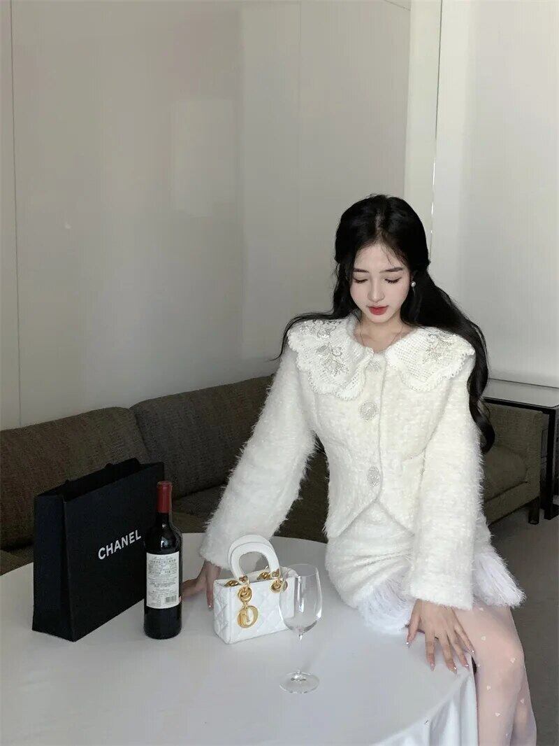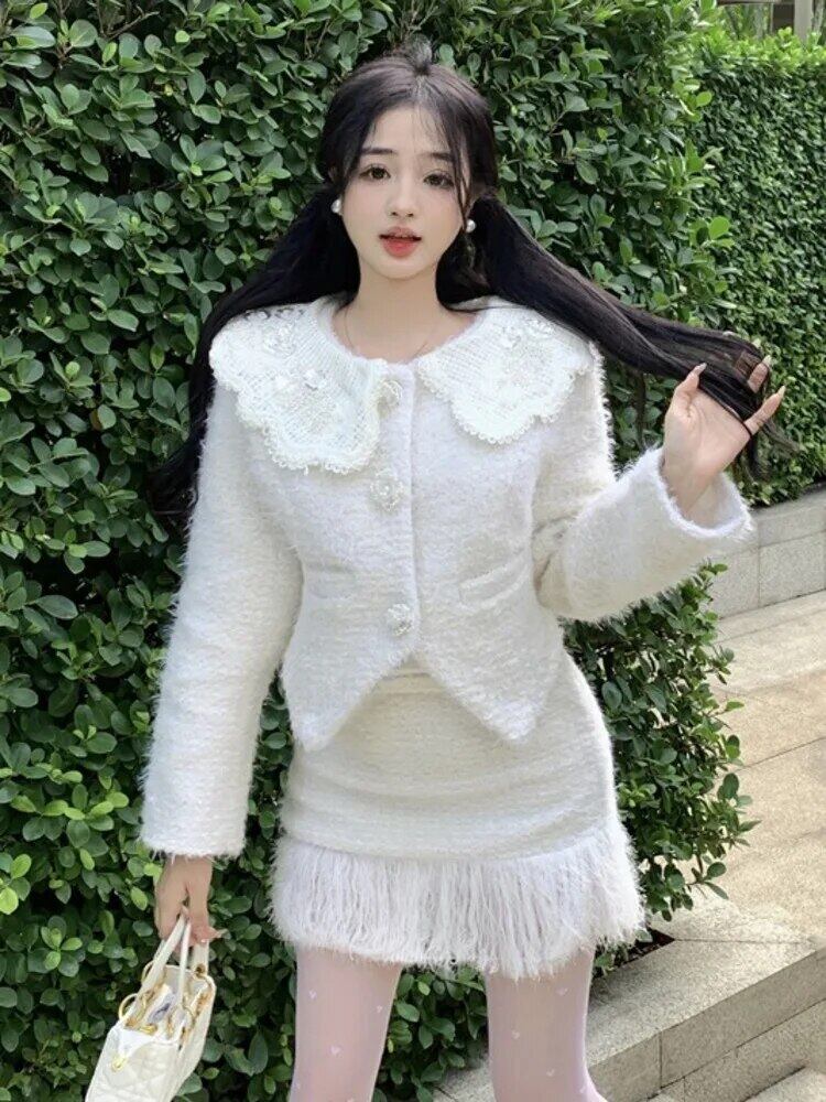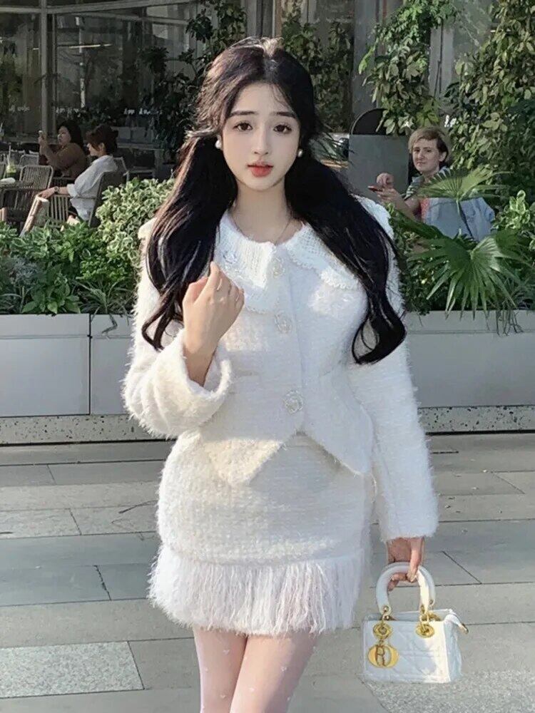 フランス小さフレグランスウール 2 点セットショートジャケットコート + ウエストスカートスーツ甘い 2 点セット 大人ガーリー スウィート キュート カジュアル