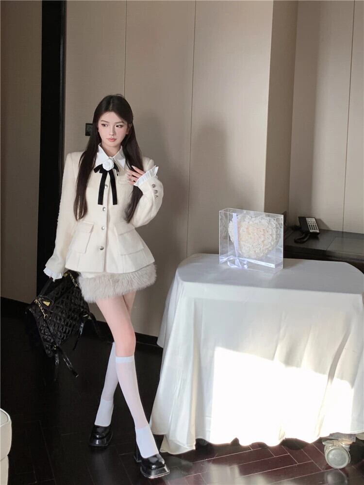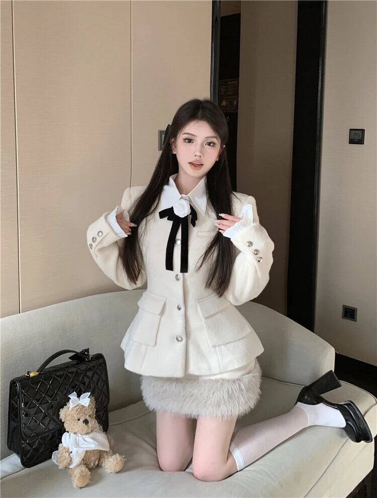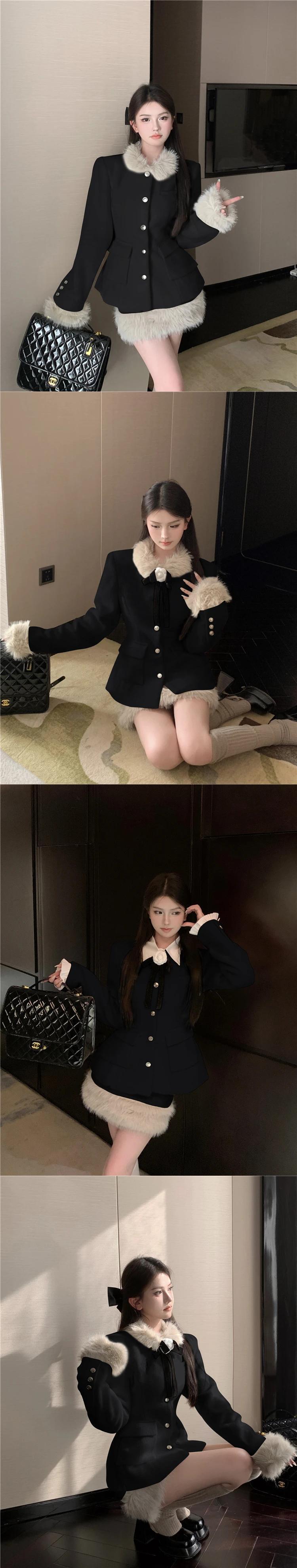 冬厚く暖かい小さ香り良いツーピースセットジャケットコート + スカートスーツ甘い 2 ピース衣装 大人ガーリー スウィート キュート カジュアル ウィンター 冬物