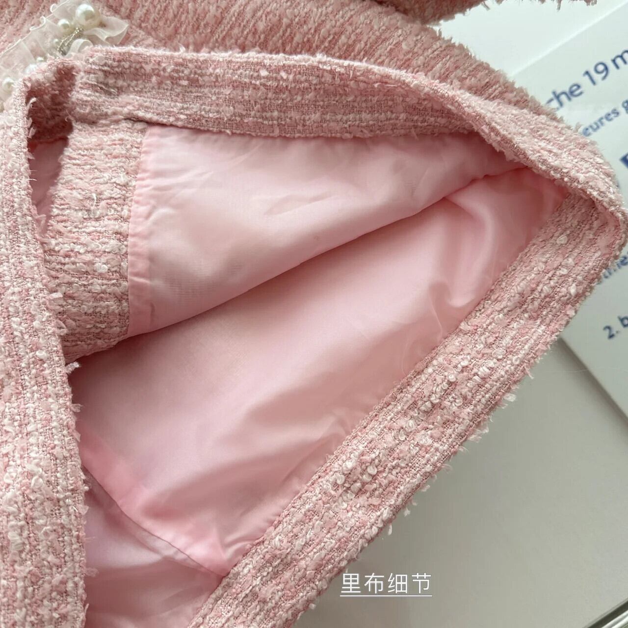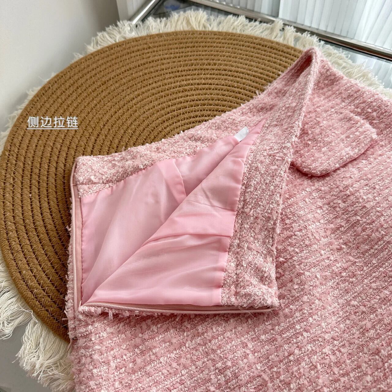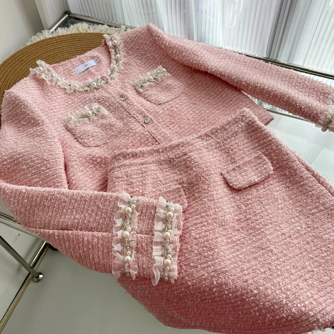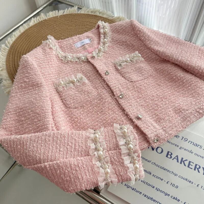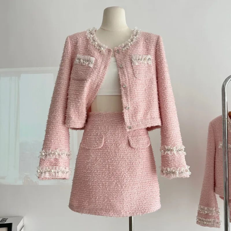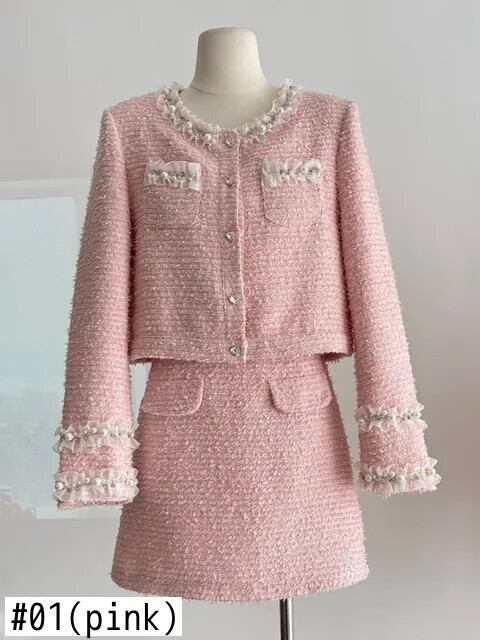ガールスウィートスモールフレグランスツイードツーピースセットショートジャケットコート+スカートスーツ高級ビーズ2ピース衣装 大人ガーリー キュート カジュアル