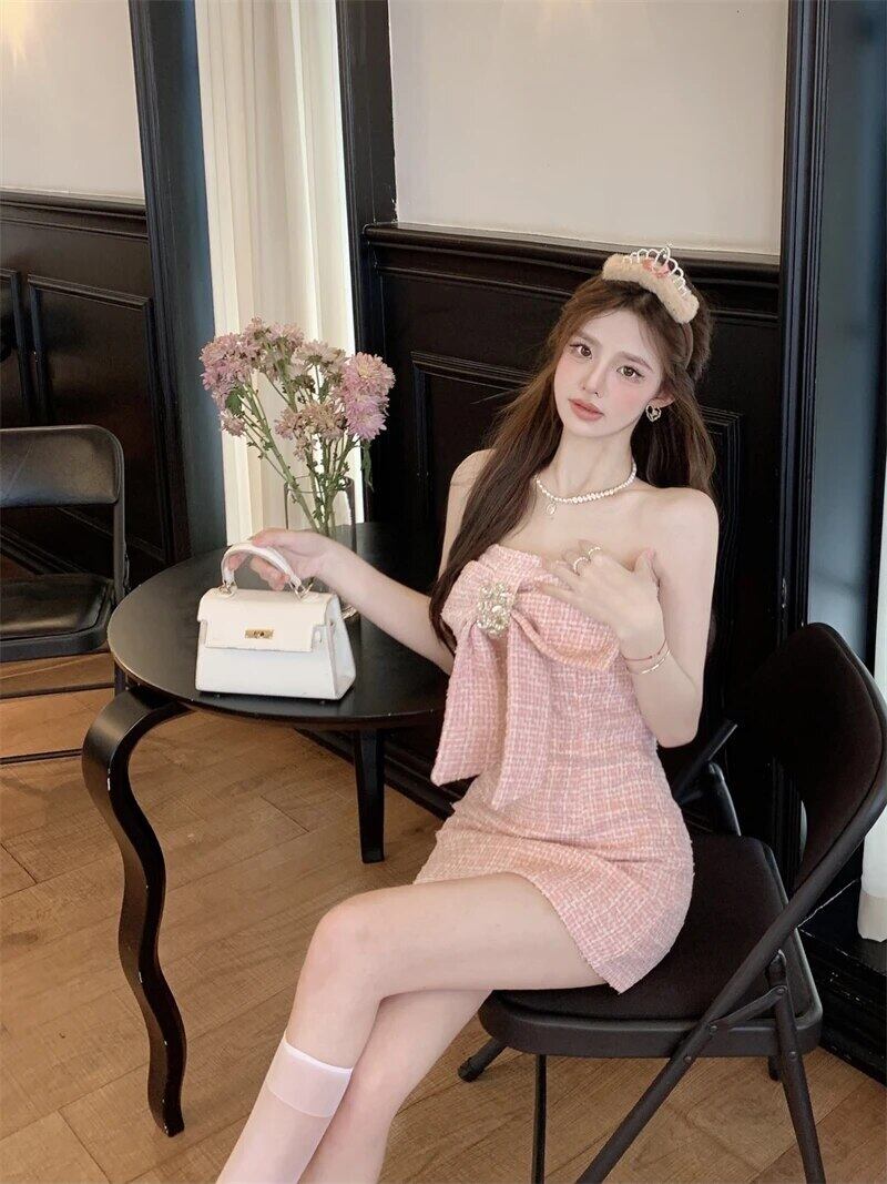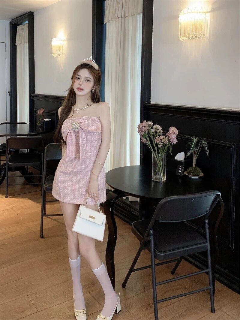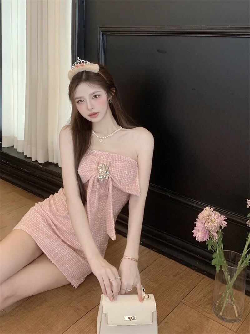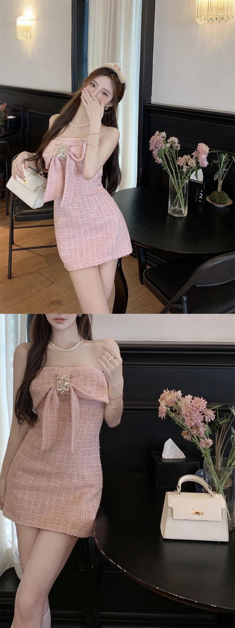 高級ダイヤモンドフレンチスモールフレグランツイードパーティードレス Hotsweet リボンセクシードレス 大人ガーリー スウィート キュート カジュアル
