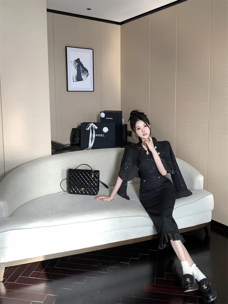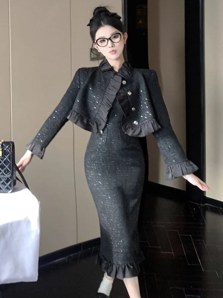 ストリートツイードツーピースセットショートジャケットコート+セクシーロングドレススーツ小さ香り2ピース衣装